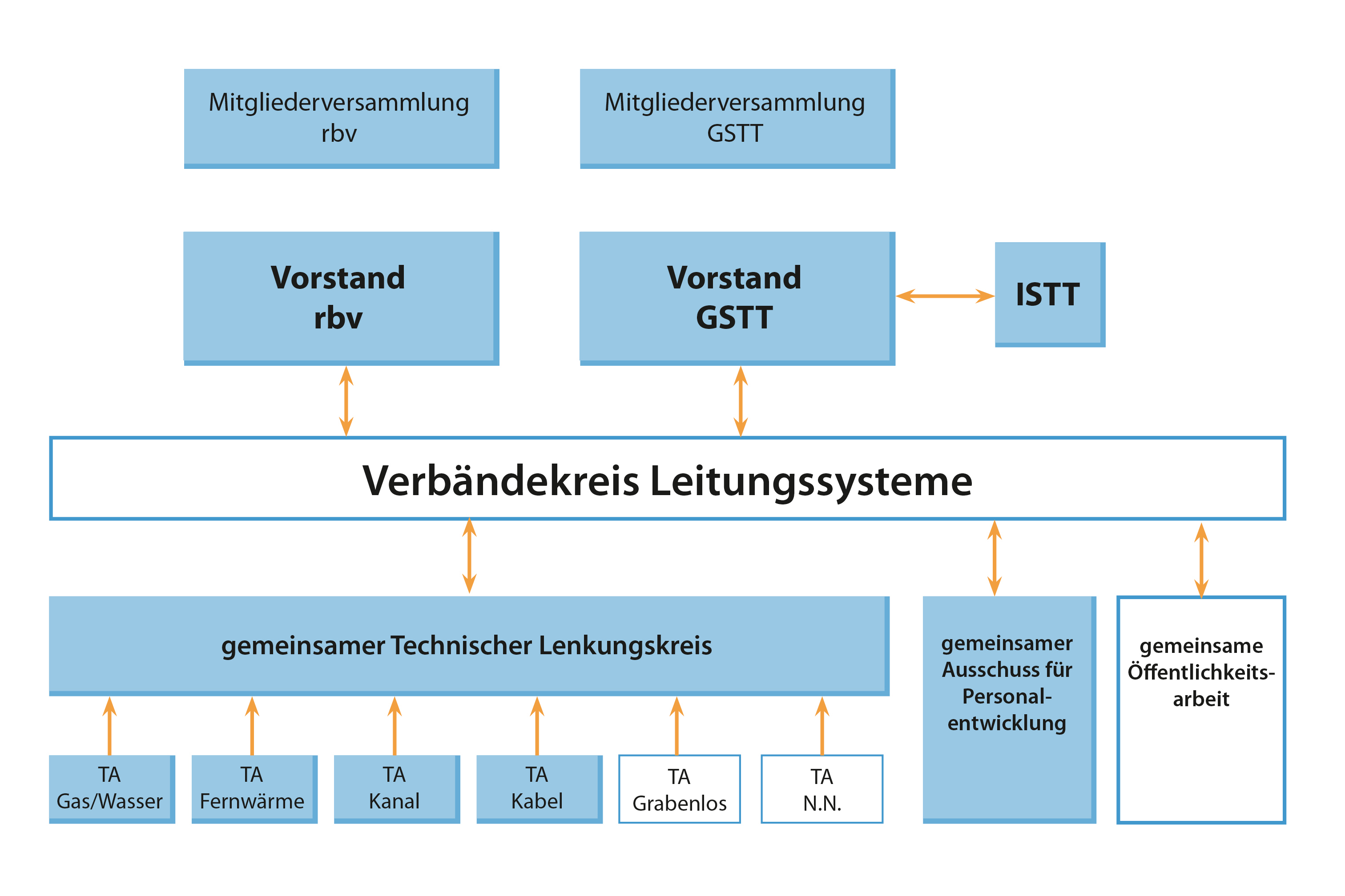 Beraten und umgesetzt werden die vom „Verbändekreis Leitungssysteme“ beschlossenen Themen durch einen gemeinsamen Technischen Lenkungskreis, in einem Ausschuss für Personalentwicklung sowie in einem neu zu gründenden Ausschuss für Öffentlichkeitsarbeit. Der Technische Lenkungskreis bestimmt die Technikpolitik von GSTT und rbv und wird von Technischen Ausschüssen unterstützt, die sich den unterschiedlichen technischen Themen widmen.