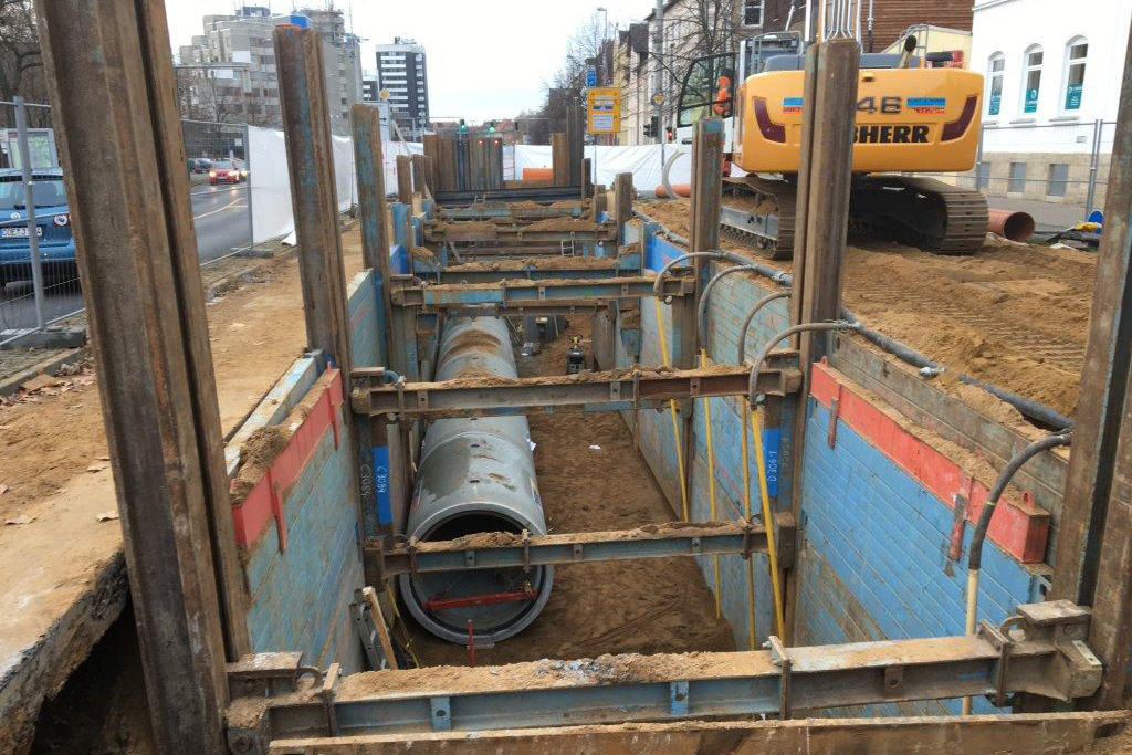 Das Ergebnis: Unter der Fahrbahndecke hatten sich mehrere Hohlräume gebildet. Zudem zeigte sich, dass der Boden, in dem ein aus dem Ende des 19. Jahrhunderts stammender Kanal eingebettet war, zu großen Teilen fehlte. Erste Hohlräume konnten zwar verfüllt werden, aber letztlich wurde deutlich, dass unter dem Rebenring auf einer Länge von etwa 540 Metern die im so genannten Doppelstocksystem angeordneten Schmutz- und Regenwasserkanäle in offener Bauweise erneuert werden mussten.