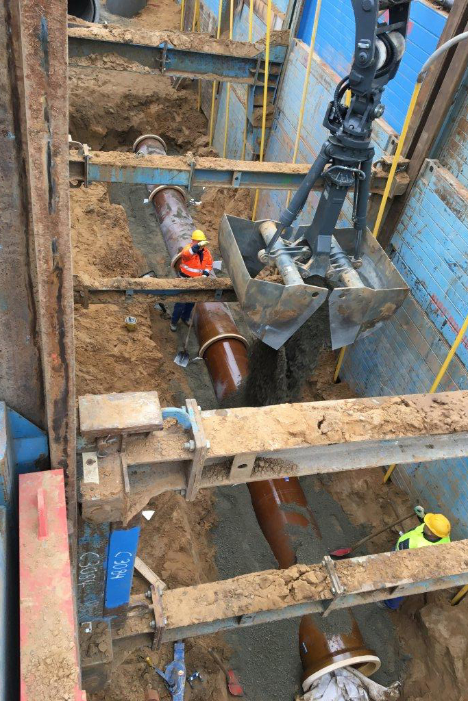 Bei der Sicherung des Rohrgrabens entschieden sich die Beteiligten nach sorgfältiger Abwägung der technischen Parameter für den Einsatz des Linearverbausystems der thyssenkrupp Infrastructure. Das hat sich bezahlt gemacht: Insbesondere mit Blick auf die Verbautiefe von knapp 7 Metern und die durchaus schwierigen Bodenverhältnisse vor Ort konnte der Linearverbau seine Stärken ebenso ausspielen, wie in wirtschaftlicher Hinsicht.