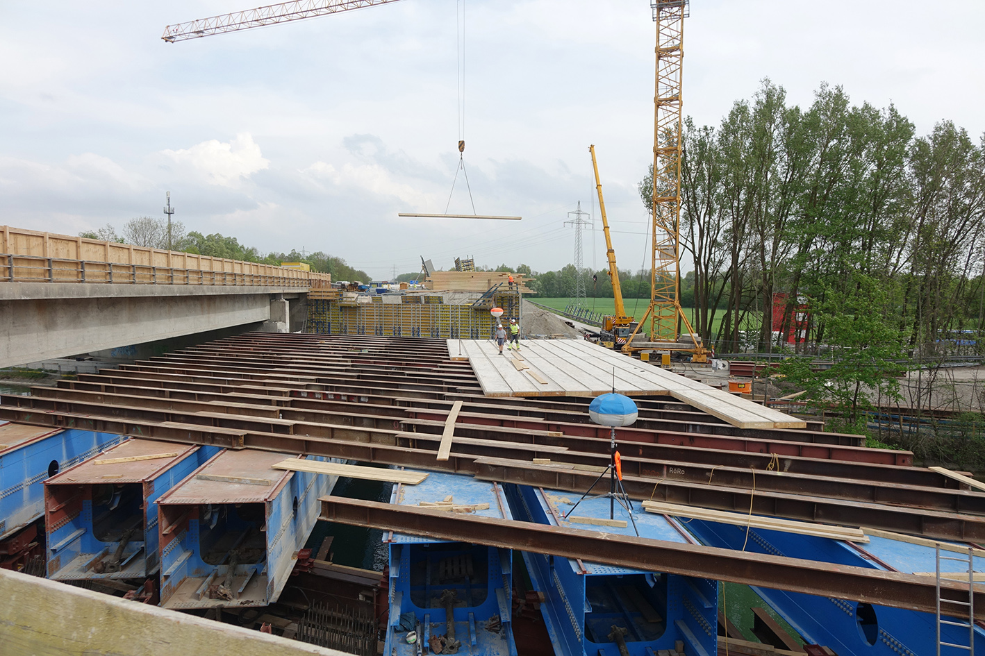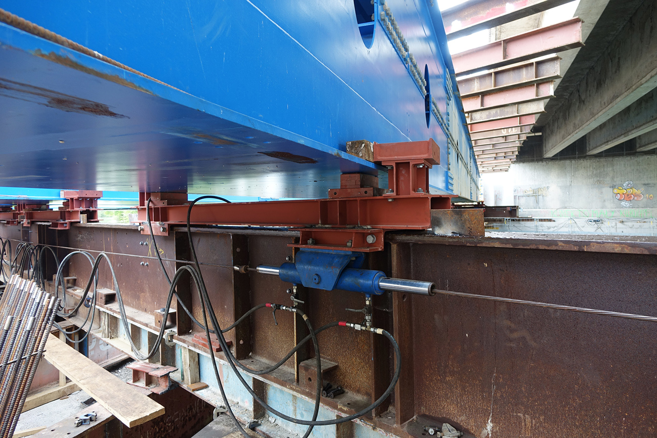 Für das Verschieben wird eine Hydraulikvorschubanlage eingesetzt, die ein präzises, simultanes Verschieben der Träger ermöglicht. Auf den Stahlbauhohlkästen montierte Querträger HEB400 gewährleisten die sichere Auflagerung die Schalung und Arbeitsgerüste, so dass der Bauprozess effizient ausgeführt werden kann. Der Brückenüberbau selbst wird in Ortbetonbauweise erstellt.