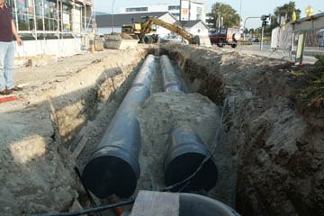 Berechnungen haben ergeben, dass im Bereich des Gewerbegebietes rund 300 l Niederschlagswasser/s je ha anfallen können. "Der für das Grundstück der Telekom ermittelte Wert liegt bei etwa 52 l/s", erläutert der verantwortliche Planer, Dipl.-Ing. Rolf Glaser. "Diese Menge muss auf etwa 8,6 l/s reduziert werden, damit der vorhandene Sammler mit der Nennweite DN 1000 auch weiterhin die anfallenden Niederschlagsmengen reibungslos ableiten kann", so Glaser weiter. Im Vorfeld der Baumaßnahme waren verschiedene Möglichkeiten für die Herstellung des Stauraumkanals erörtert worden. Zur Diskussion stand eine Ausführung in Ortbeton oder mit Stahlbetonrohren. In dieser Situation empfahl Jürgen Gäßler, Fachberater der Funke Kunststoffe GmbH, den Einsatz der Connex®-Kanalrohre.