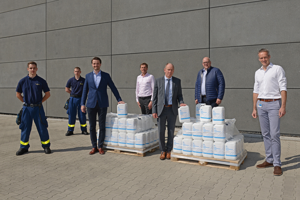 MC-Bauchemie hat im April 2020 der Stadt Bottrop ein österliches Geschenk gemacht und 500 Liter Desinfektionsmittel gespendet. Oberbürgermeister Bernd Tischler nahm eine Palette mit 100 Gebinden à 5 Liter Desinfektionsmittel auf dem Betriebsgelände der MC-Bauchemie von Betriebsleiter Michael Schilf, Leiter Forschung & Entwicklung John van Diemen, Business Development Manager Björn Kracht und Geschäftsführer Nicolaus Müller entgegen.