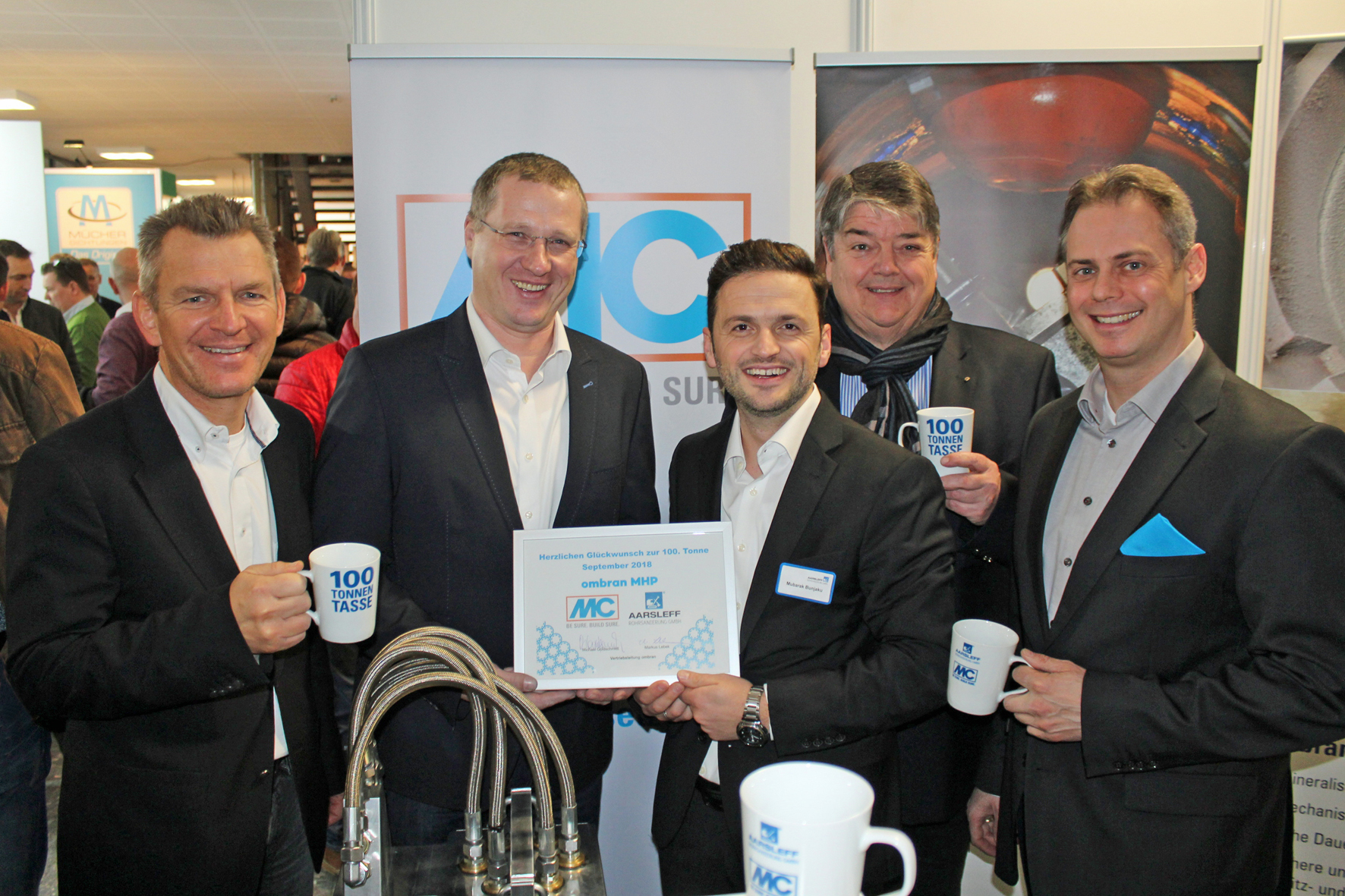 Zum Dank für den Kauf der 100. Tonne der Reprofilierungs- und Beschichtungsmörtel aus der ombran MHP Produktfamilie in 2018 überreichte MC-Bauchemie der Aarsleff Rohrsanierung GmbH beim 33. Oldenburger Rohrleitungsforum am 14. und 15. Februar 2019 Hundert Kaffeebecher mit der Aufschrift „100 Tonnen Tasse“.
