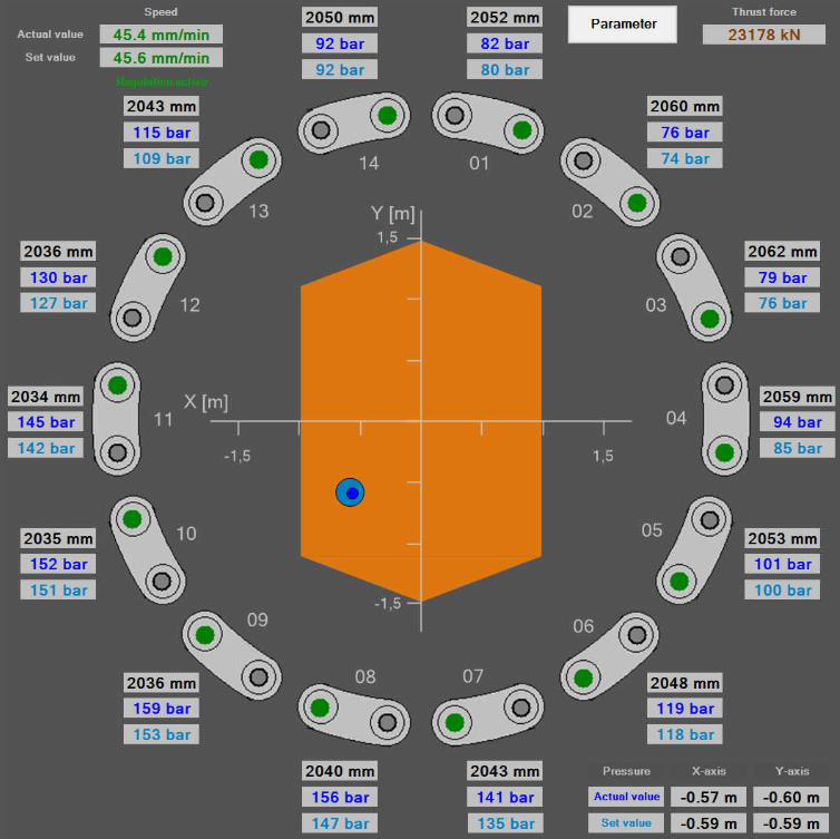 Im kontinuierlichen Vortrieb steuert der Maschinenfahrer nicht mehr manuell über Drehregler (Potentiometer) auf dem Bedienpult, mit denen er die Drücke in den Vortriebszylindern reguliert. Herrenknecht hat hierfür das System Center of Thrust (CoT) neu entwickelt, das den Schildfahrer unterstützt, die Maschine präzise zu steuern. Es besteht aus einem Panel, das dem Bediener die aktuelle Lage des Druckschwerpunktes anzeigt und auf dem er die gewünschte Position des Druckschwerpunktes wählt. Die entsprechende Ansteuerung der Vortriebszylinder übernehmen die Algorithmen des Systems. Im Vergleich zur manuellen Steuerung über Potentiometer bietet der CoT die Perspektive, Richtungsvorgaben effizienter und effektiver auszuführen. Das CoT-System kann somit nachhaltig zur Wirtschaftlichkeit des Bauvorhabens sowie zur Qualität des unterirdischen Bauwerks beitragen.