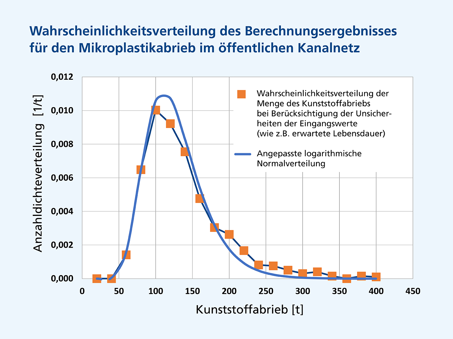 »Da wir die Parameter nur sehr unsicher bestimmen können, haben wir für jeden Parameter ein gewisses Intervall geschätzt«, erklärt Jan Blömer, Abteilung Nachhaltigkeit und Partizipation. »Den Abrieb berechnen wir jeweils für 1000 Parameterkombinationen. Daraus können wir dann einen wahrscheinlichen Abrieb mit einer gewissen Schwankungsbreite bestimmen.« Der Abrieb pro Jahr ergibt sich so aus der Kanalnetzlänge multipliziert mit dem Anteil der Kunststoffrohre, der Verschleißbreite und der Verschleißtiefe geteilt durch die Lebensdauer.