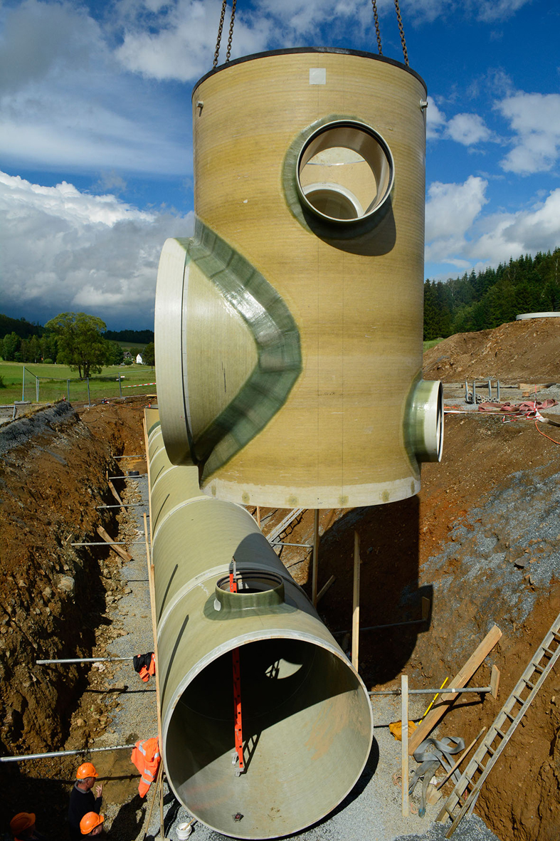 - dem eigentlichen Stauraumspeicher aus großvolumigen GFK-Rohren (bis DN 3000)