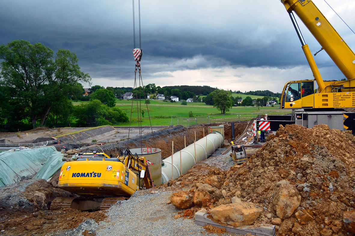 Der Bau des reinen Stauraumkanals mit Schachtbauwerken einschließlich Tiefbauarbeiten und Installation der AmiScreen-Grobstoffrückhalterohre nahm insgesamt vier Wochen in Anspruch. Eine derart kurze Bauzeit wäre bei einer Anlage in klassischem Beton-Tiefbau nicht ansatzweise realisierbar gewesen - ein Argument, das der Amiantit Germany GmbH bei der Installation von GFK-Speichersystemen in den letzten Jahren immer wieder als "Ausschlag gebend" begegnet.