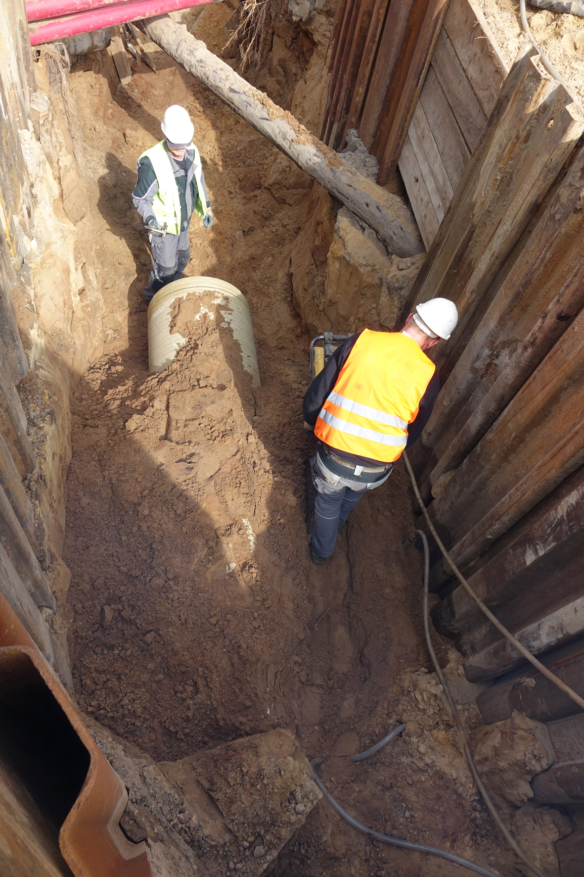 Als gute Wahl für die Elmshorner Baustelle empfahlen sich die GFK-Rohre aber nicht zuletzt aufgrund ihrer geringen Wandstärke. "Die Gasleitung der Schleswig-Holstein Netz AG liegt in ca. 1,20 m Tiefe, die Sohle der Kanalisation zwischen 2,30 und 2,40 m", führt Schachtmeister Schöneweiß aus. "Im Klartext bedeutet das: Zwischen Gasleitung und Regenwassersammler blieb ein Abstand von gerade einmal 10-20 cm."