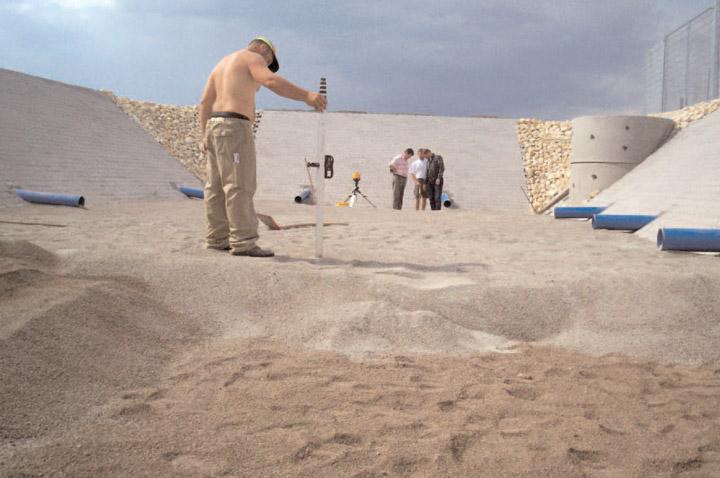 Auf der 8.532 m2 großen Hoffläche „Nord“ ist die Lagerung von verzinkten Stahlteilen vorgesehen. Hier kann es bei Regen zur Ausschwemmung von Zinkanteilen kommen. Das von den beteiligten Baupartnern gemeinsam entwickelte Konzept sieht vor, dass das mit Zink versetzte Oberflächenwasser ebenfalls in einem Versickererdbecken gesammelt wird. Das Besondere: Das Becken ist mit einem Sand-Lava-Gemisch sowie einer 30 cm starken Schicht des D-Rainclean®-Substrates(Zn) befüllt, welches das durchströmende Regenwasser praktisch rückstandsfrei reinigt. Das Substrat wurde von der Funke Kunststoffe GmbH entwickelt und in seiner ursprünglichen Zusammensetzung seit einigen Jahren in Kombination mit einer Sickermulde vertrieben, die zur Behandlung und Versickerung von belasteten Niederschlagsabflüssen eingesetzt wird.