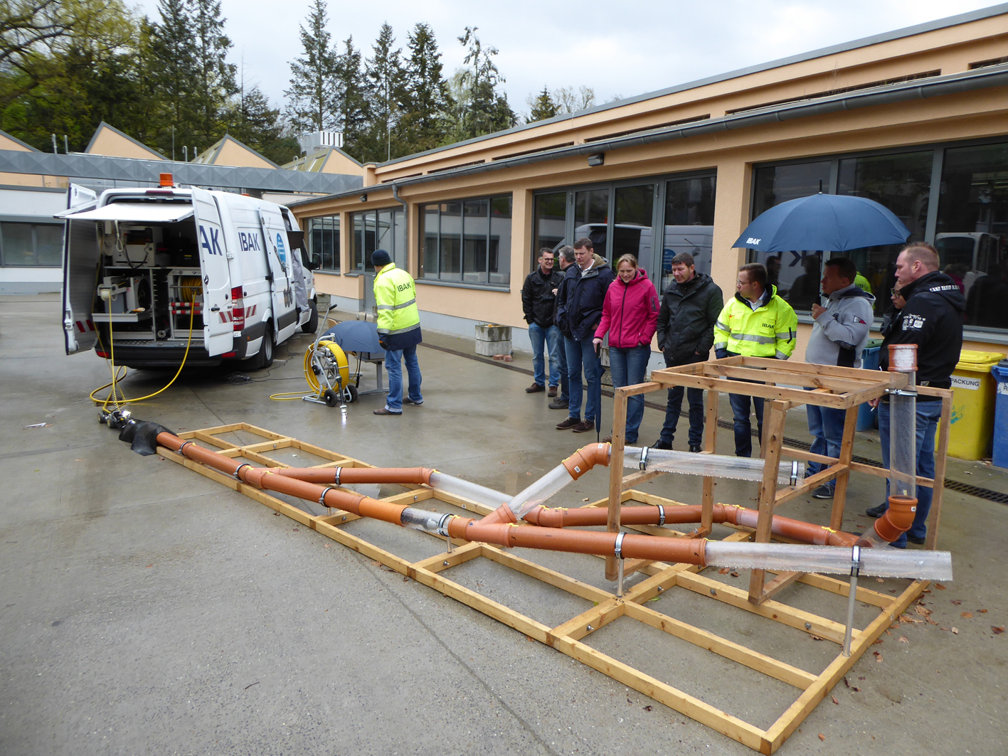 Die Demonstrationen wurden im Spül- und Schiebebetrieb vorgeführt, wobei der Spülbetrieb und die damit verbundene Hydrostatische Höhenmessung die größte Aufmerksamkeit generierte. Denn auch wenn die Theorie bereits die Fähigkeiten erklärte, so waren die meisten der anwesenden Besucher skeptisch, ob die Genauigkeit tatsächlich gewährleistet werden kann. Deswegen wechselten die Blicke zwischen dem Rohrparcours, durch den die abbiegefähige Schiebekamera POLARIS mit Spülvortrieb vorangetrieben wurde, und dem Monitor am Bedienraum des Fahrzeugs, auf dem der Weg der Kamera 1:1 nachzuvollziehen war. Jede Skepsis konnte widerlegt werden, da die Ergebnisse der Genauigkeit eindeutig für sich sprachen.