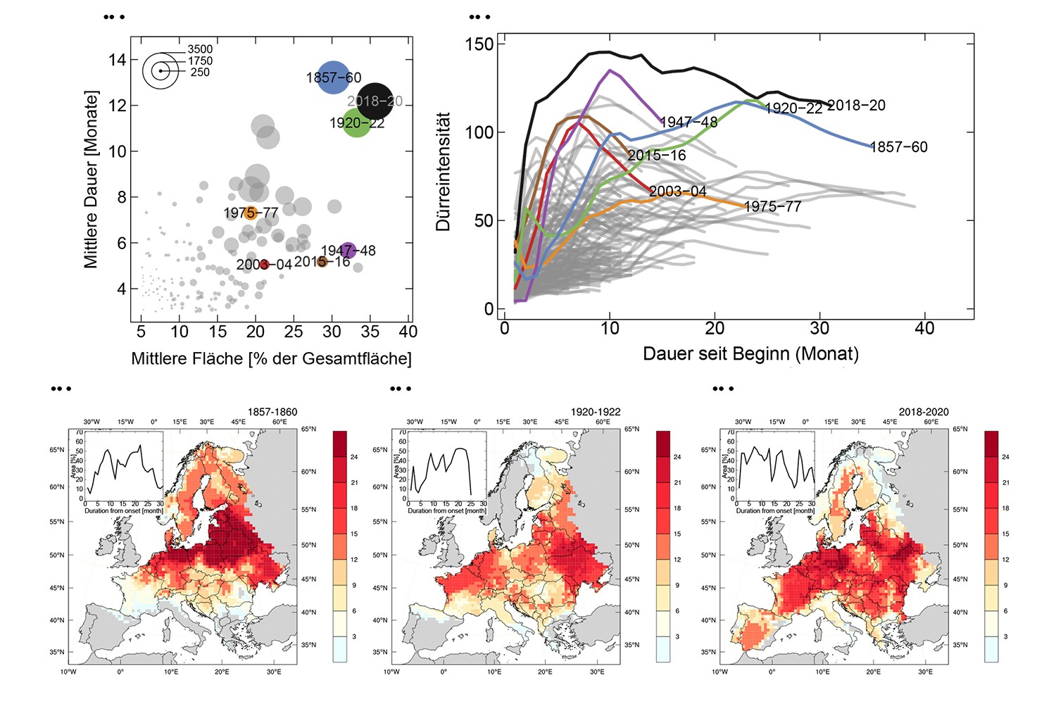 Außergewöhnlich lang war auch die durchschnittliche Dürredauer in den 50 x 50 km großen Gitterzellen, in die die Wissenschaftler Europa für ihr Modell eingeteilt haben. Weil sich ein Dürreereignis dynamisch über Raum und Zeit entwickelt, also an einer Stelle beginnt, sich dann weiterentwickelt und schließlich eventuell an anderer Stelle endet, unterscheidet sich dieser Wert von der Gesamtdauer des Dürreereignisses. Für das 2018-2020-Ereignis wurde eine durchschnittliche Dürredauer von 12 Monaten ermittelt.