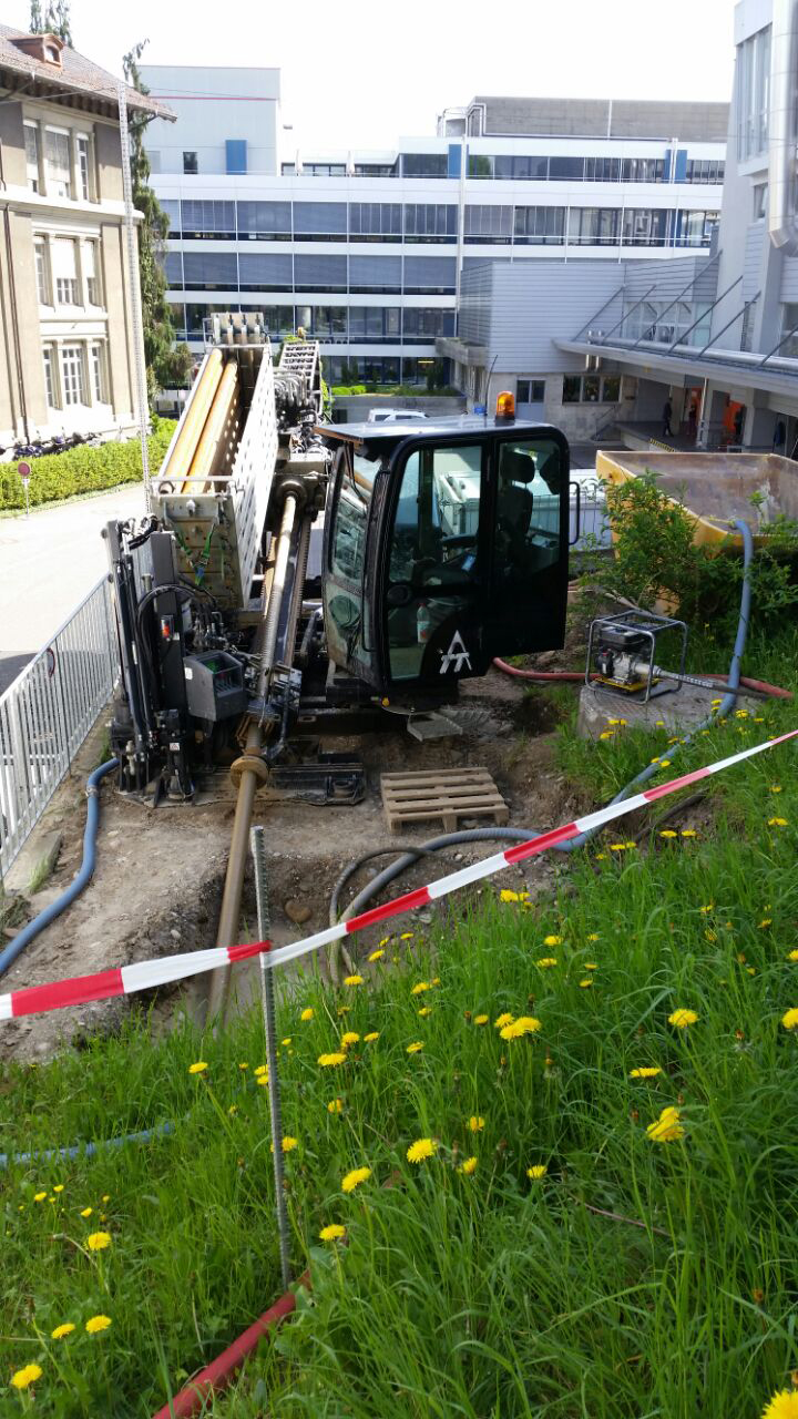 Die 70 m lange Bohrtrasse auf dem dicht bebauten Klinikgelände verlief entlang der Spitalkappelle in einen Lüftungsraum im Keller des INO. Wegen der sehr engen Platzverhältnisse im Startbereich wurde in Absprache mit allen Beteiligten eine 2.50 m hohe Aufschüttung zwischen Gebäude und Tanklager als Startplatz der Bohranlage gewählt. Der in ca. 3 m tief gelegene Lüftungsraum musste mit einer horizontalen und vertikalen Zielgenauigkeit von +/- 20 cm erreicht werden, um Schäden an bestehenden Leitungen im Gebäude zu vermeiden. Alles in allem genau die richtige Aufgabe für das erfahrene Team der Firma Zemp.