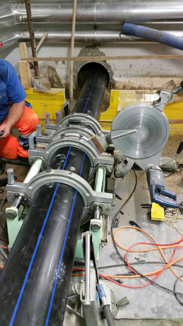 Die Pilotbohrung in bis zu 6.50 m Tiefe verlief problemlos. Nachdem das Ziel erreicht war, wurde über das Pilotloch ein Kernloch von 450 mm Durchmesser durch die Gebäudewand in den Lüftungsraum gebohrt, durch das der Backreamer Ø 400 mm gezogen wurde. Nach nur einem Aufweitvorgang konnte die neue Druckrohrleitung in die Trasse eingezogen werden. Aufgrund mangelnden Platzes im Kelleraum durften die einzelnen Rohre nur 2.50 m lang sein und wurden am Zielort zu Strängen von 12,50 m zusammengeschweißt. Während des Rohreinzugs musste dann alle 12,50 Meter ein so vorbereiteter Rohrstrang angeschweßt werden.