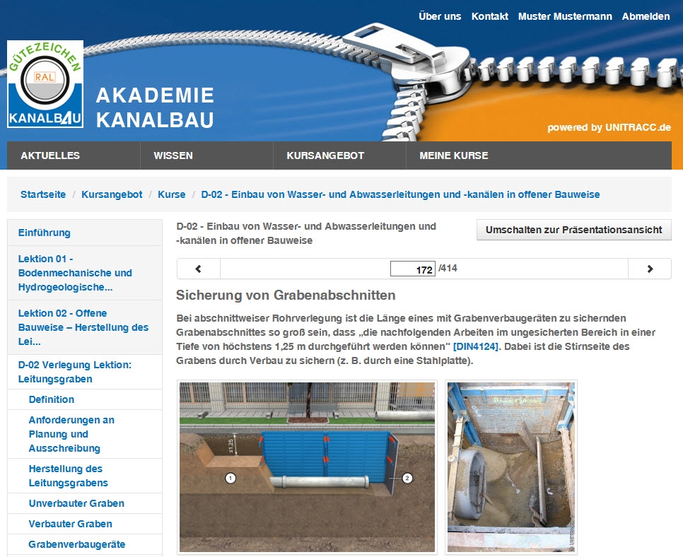 Gütezeicheninhaber der Beurteilungsgruppen „Kanalbau in offener Bauweise“ (AK) – hierzu zählen die Gruppen AK3, AK2, AK1 – sowie Gütezeicheninhaber der Beurteilungsgruppe „Ausschreibung und Bauüberwachung Kanalbaumaßnahmen in offener Bauweise“ (ABAK) erhalten im Juli diesen Jahres Zugangsdaten von der Gütegemeinschaft für die Anmeldung und Nutzung der Plattform. Nach dem Einloggen hält ein persönlicher Arbeitsbereich unterschiedliche Angebote für den Nutzer bereit. Das Arbeiten mit den verschiedenen Inhalten des E-Learning-Moduls nimmt in Abhängigkeit des Kenntnisstands des Nutzers ungefähr 30 Stunden in Anspruch.