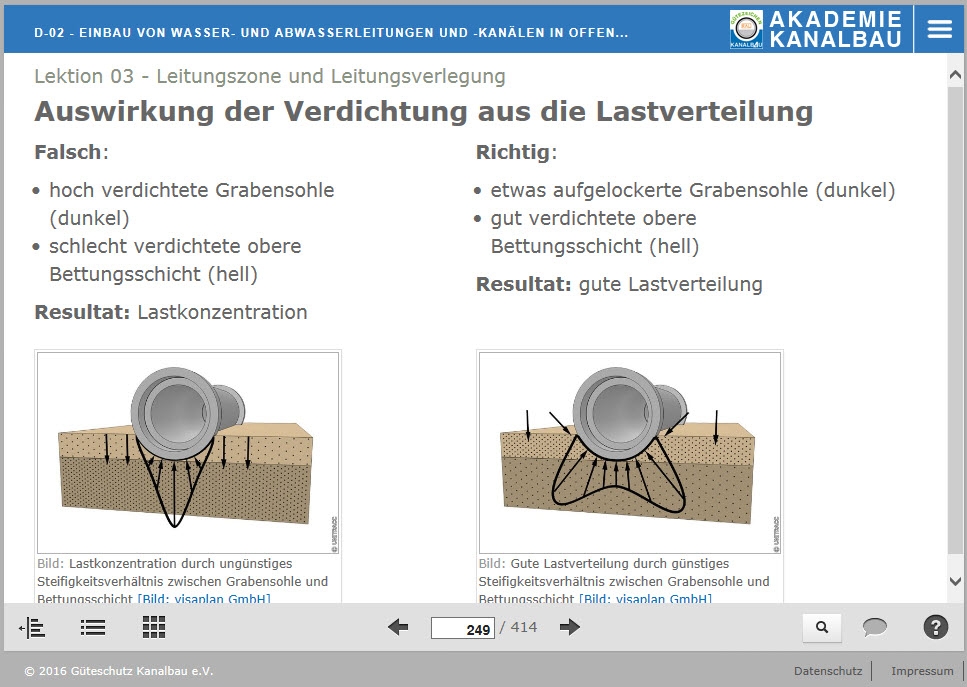 Hierauf hat die Gütegemeinschaft Kanalbau reagiert und eine Unterstützung für Gütezeicheninhaber AK und ABAK bereit gestellt: Mit dem neuen E-Learning-Modul der Gütegemeinschaft Kanalbau können sich Berufseinsteiger fachlich auf ihre zukünftigen Aufgaben vorbereiten und auch erfahrene Praktiker profitieren hiervon, denn sie können das vorhandene Wissen überprüfen und auf den neuesten Stand bringen.