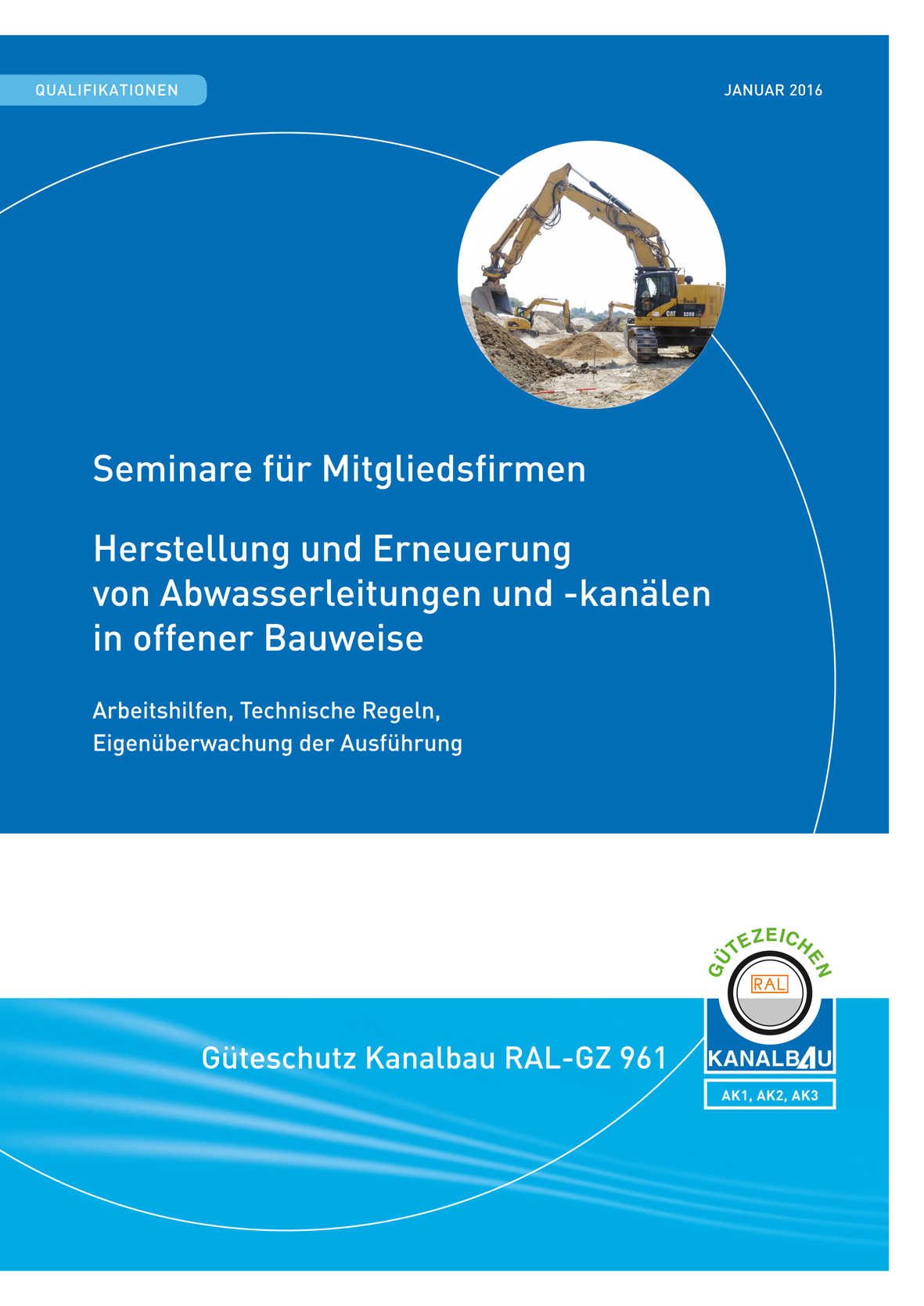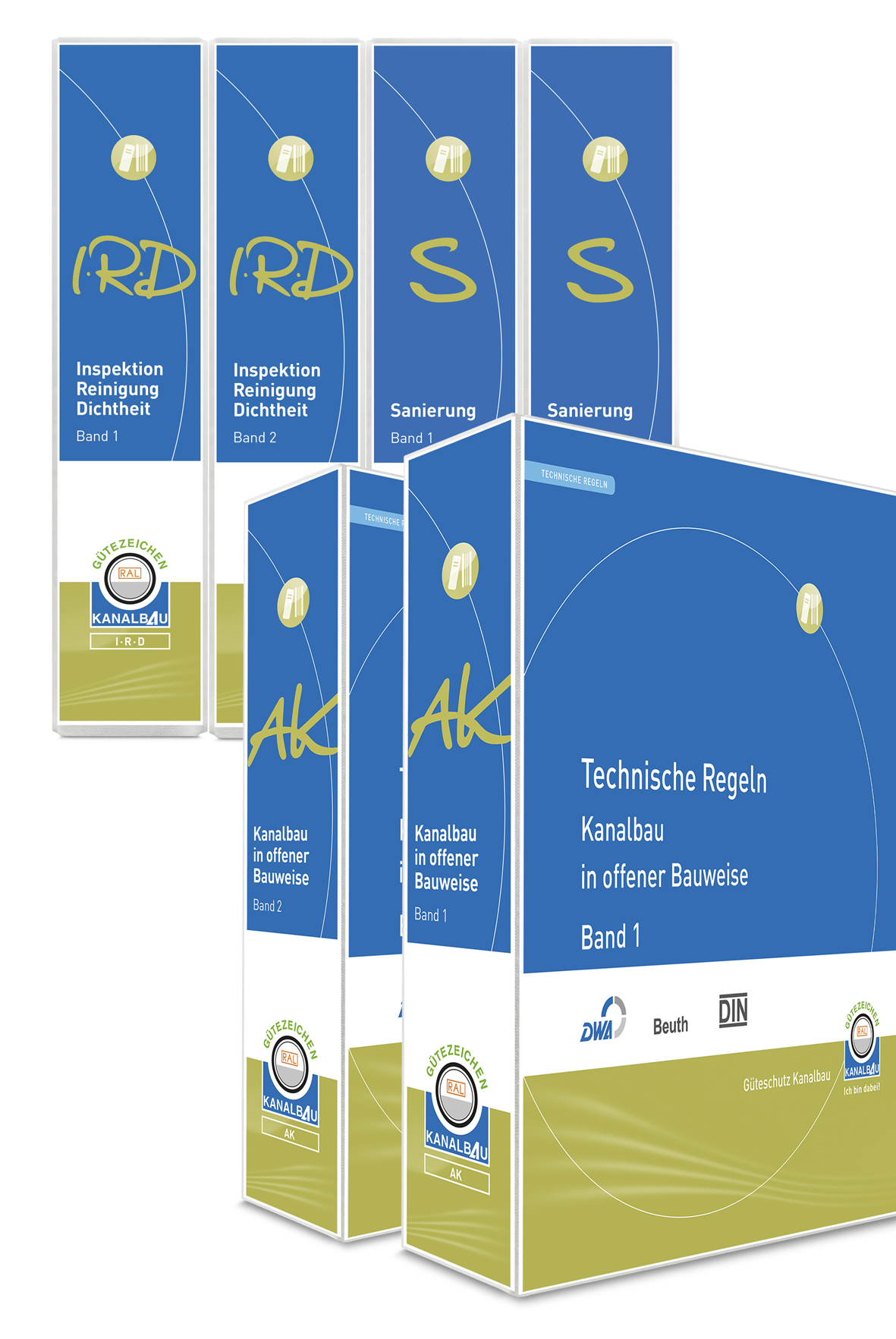 Die zweibändige Loseblattsammlung ,,Kanalbau in offener Bauweise – Zusammenstellung der für die Bauausführung wesentlichen Technischen Regeln“ haben die Gütezeicheninhaber der Beurteilungsgruppe AK (offene Bauweise) 2014 im Rahmen ihrer Mitgliedschaft kostenlos erhalten. 2015 konnten sich Gütezeicheninhaber mit Beurkundung ABS oder Beurkundung S über eine zweibändige Zusammenstellung freuen, welche die für die Ausführung wesentlichen Technischen Regeln zur „Kanalsanierung in grabenloser Bauweise“ zusammenfasst.
