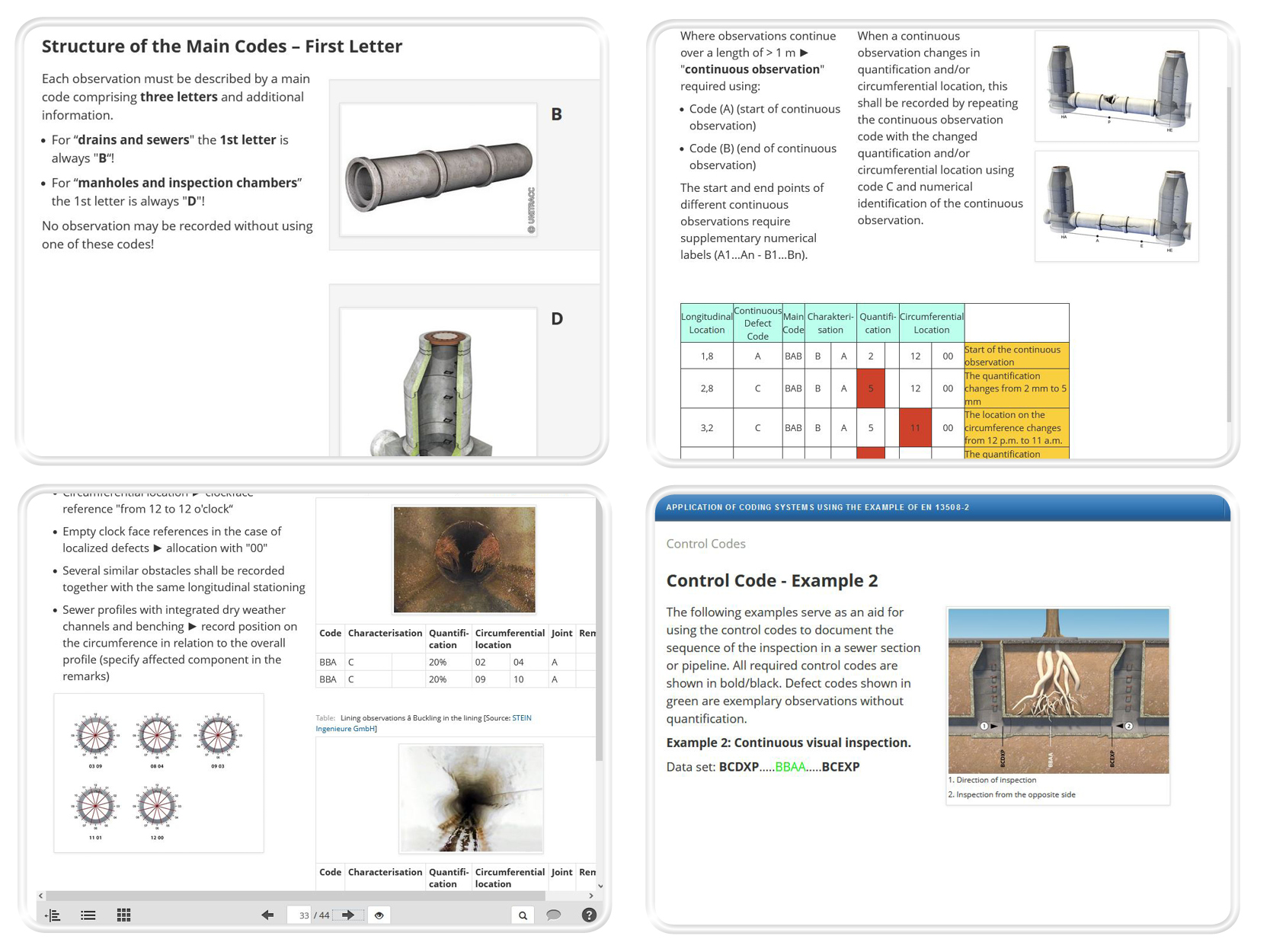 The documentation of damages, defects, and other observations in sewers and pipes within the scope of CCTV inspection is not possible without a uniform nomenclature. In Europe, EN 13508 Part 2: Coding system for visual inspection provides the normative basis for documenting and describing various observations, which later serve the engineer as a basis for assessment. This module provides the basic knowledge required for the structure and application of the coding system.
