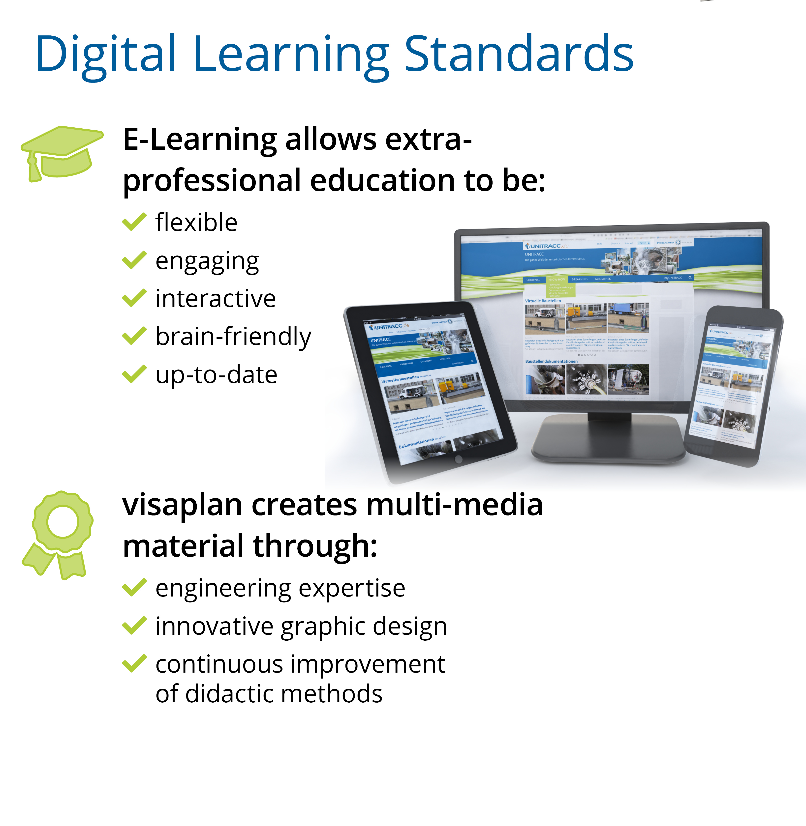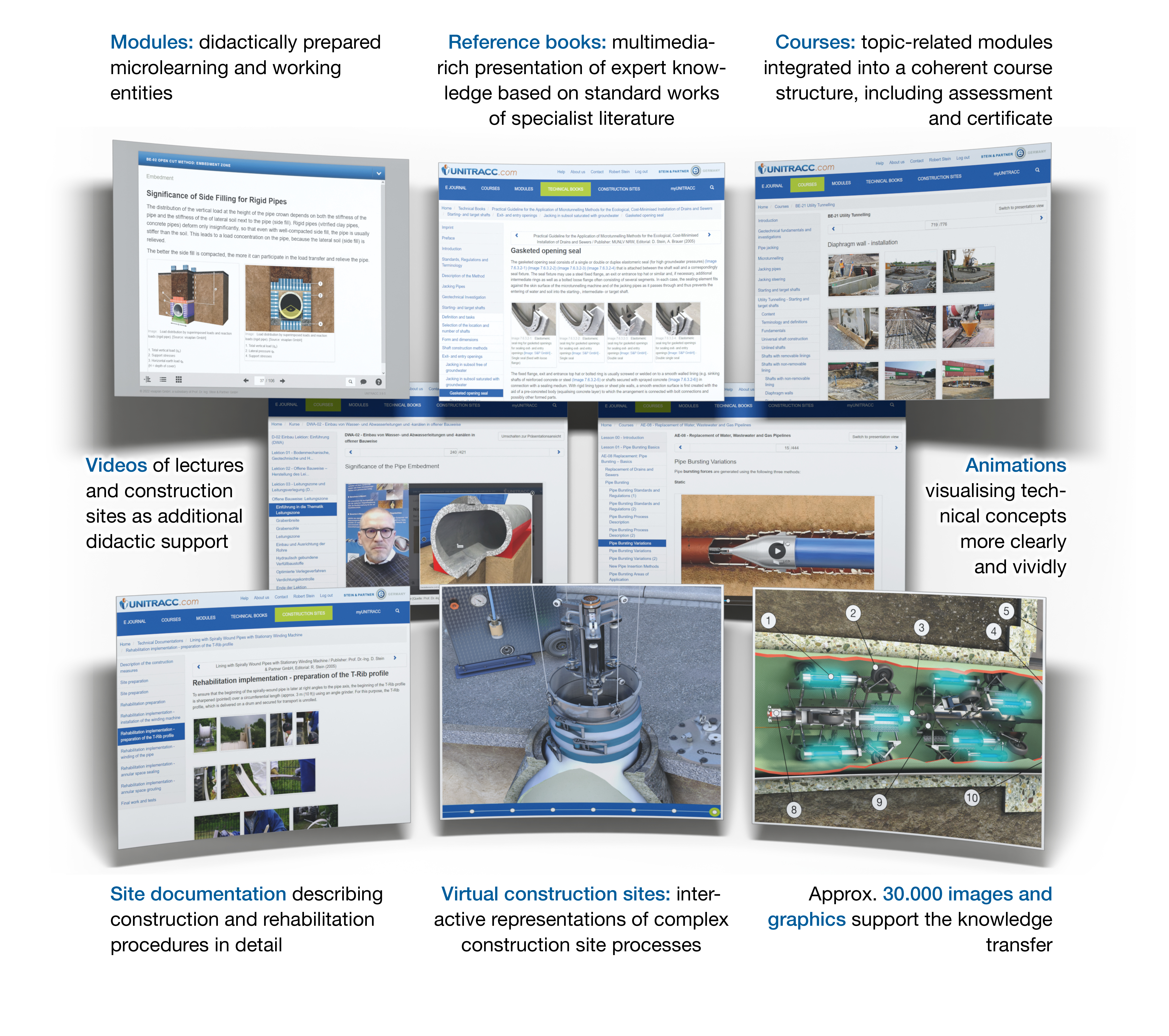 UNITRACC is an e-learning, information, and working platform for underground construction. It has been providing online training courses to customers - who are mainly public agencies, engineering offices, higher education institutions, and skilled individuals - since 2003. The UNITRACC Knowledge Portal for Enterprises offers digital access to all courses, modules, construction site documentations, and technical books about the rehabilitation and maintenance of drains and sewers for a monthly fee of 150 €. Topics include water and wastewater pipeline construction, rehabilitation, management, and maintenance. They cover a huge variety of trenchless construction and rehabilitation technologies such as utility tunneling, microtunneling, pipe bursting, lining with close-fit pipes, lining with continuous pipes, lining with spirally-wound pipes, lining with cured in cured-in-place pipes (CIPP), injection and sealing processes as well as open cut method. Registration is free of charge. Click here to start the booking process.