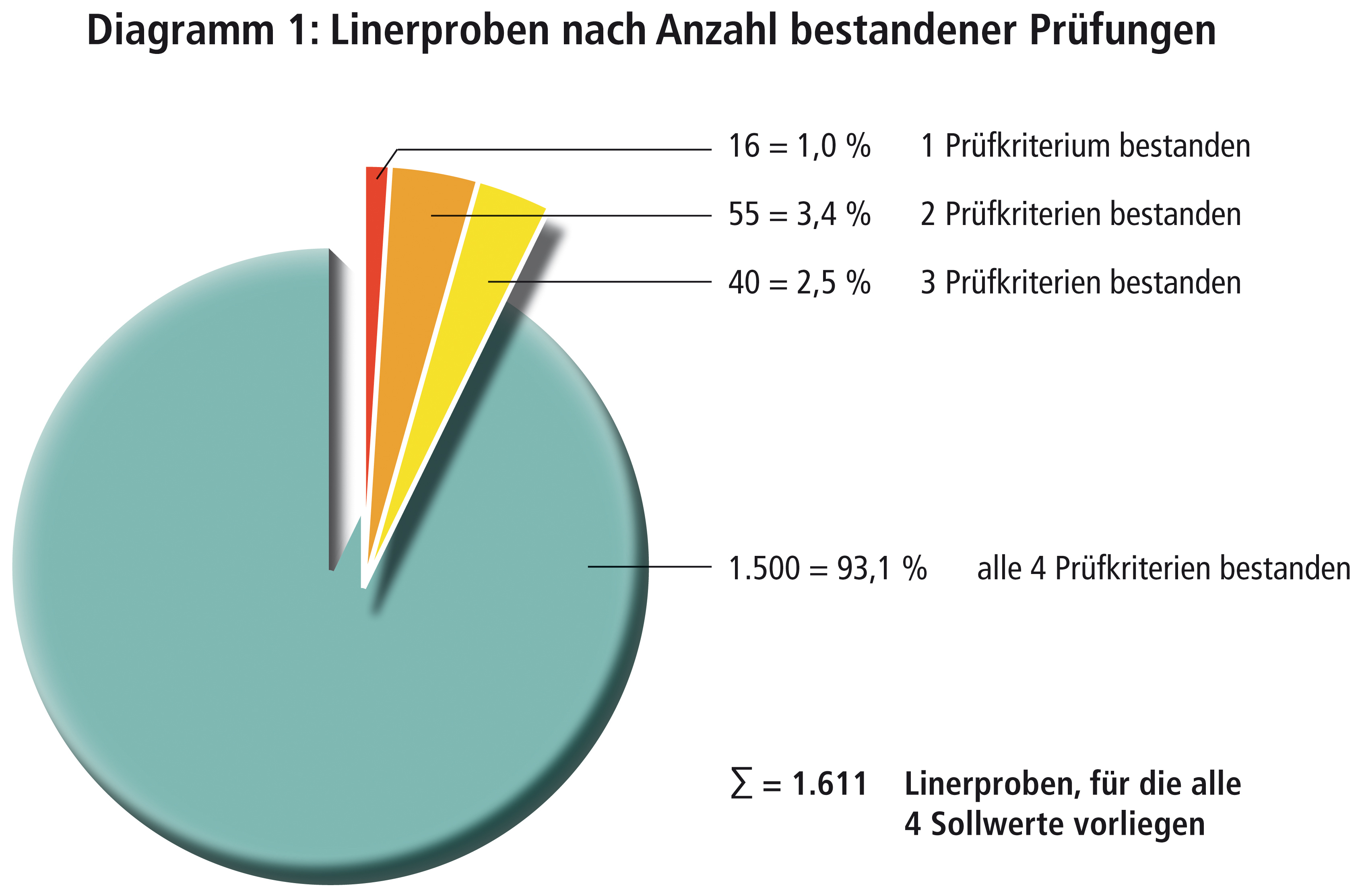 Gleiches gilt für den Anteil der Schlauchliner-Proben, die alle vier Prüfkriterien gleichzeitig erfüllen. Dieser ist mit 93 Prozent nicht besonders beeindruckend, weil er bedeutet, dass jeder 14. Liner die Qualitätsanforderungen nicht vollumfänglich erfüllt.