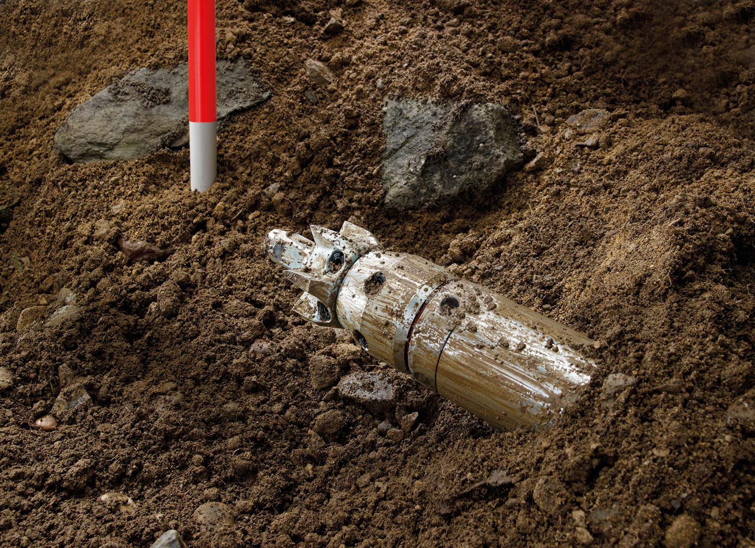After excavating the necessary minimum start and target pits (each on one side of the road) and aligning the machine to the target, the pneumatically driven GRUNDOMAT 45 worked its way under the road at a depth of around 0.6 m along the given path reliably and effectively with a high degree of accuracy. The ground, consisting of clay with a sandy component, and the occasional groundwater horizon posed no problems whatsoever for the installation - the soil was gradually displaced outwards without any effort. Even existing old drinking water and sewage pipes as well as communication and gas pipes could be passed under without damage.