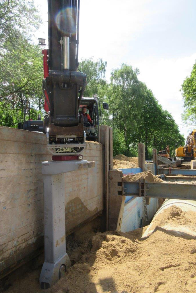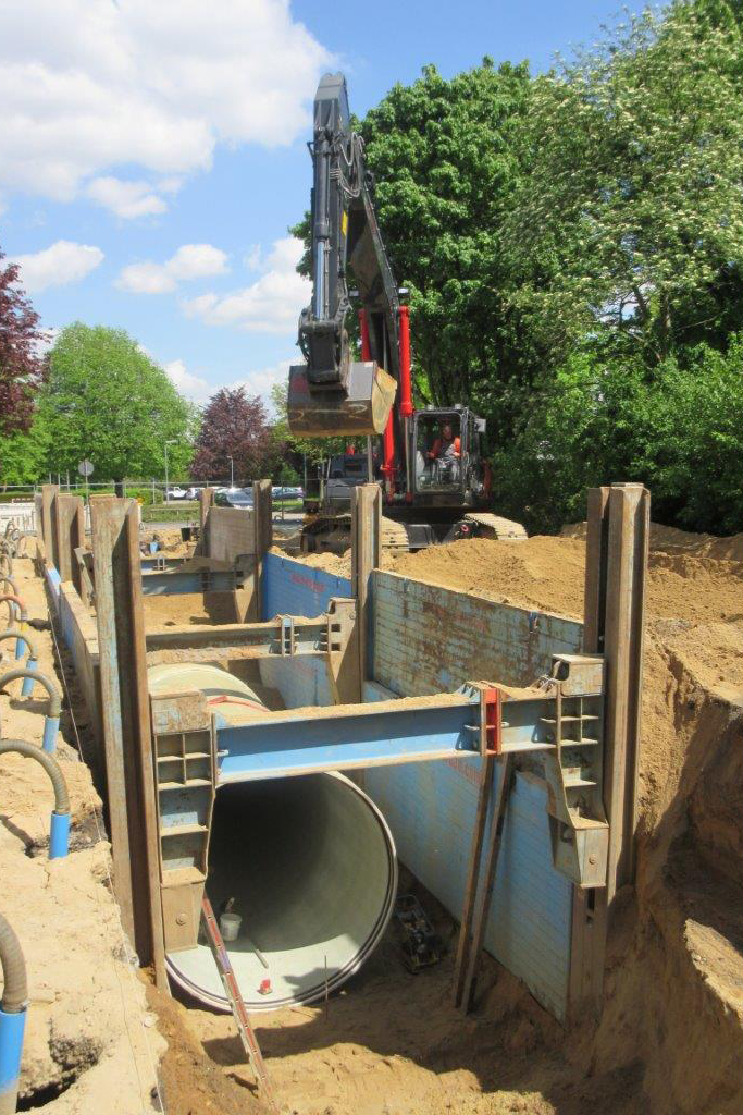 Die außergewöhnlichen Abmessungen der Rohre hätten natürlich auch direkten Einfluss auf die Tiefe der Baugrube gehabt, merkt Bauleiter Bougé an. „Der Verbau musste 4,50 m tief sein, die Modulgrößen wurden speziell auf die zu verlegenden Rohre abgestimmt – die Felder wurden so dimensioniert, dass die Rohre eingefädelt werden konnten“, erinnert sich Bougé. Die Dimensionen der Rohre und des Verbaus machten das Bauvorhaben zudem logistisch anspruchsvoll, zumal nur wenig Platz für die Zwischenlagerung zur Verfügung gestanden habe. Zum Glück konnte der Auftraggeber während der Bauzeit auf dem Parkplatz des aqua-sol-Erlebnisbades zusätzlichen Lagerraum zur Verfügung stellen. Für das Einbringen des Verbaus und das Verlegen der Rohre kamen zwei 35 t Bagger zum Einsatz, die tägliche Verlegeleistung lag bei rund zwei Rohren bzw. 12 m.