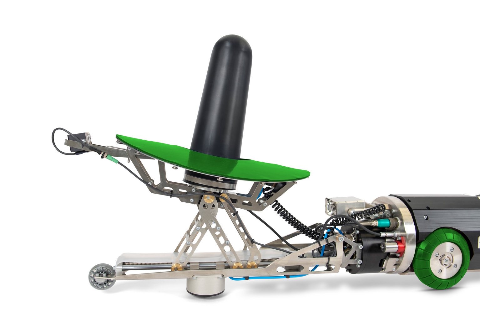 Die zweite Ausführung, HSS300, eignet sich für Anwendungsbereiche mit Nennweiten von DN 350 bis 600 (800) Millimeter. Sie besteht aus einem freischwebenden, drehbaren und abklappbaren Ausleger. Auf das starre Formschild sind unterschiedliche Gummiblasen als bilaterales Bauteil montierbar – hier sind sowohl das Formschild, also auch die Gummiblasen beheizbar. Aufgrund des Scherenhubs wird der Laminathut optimal positioniert und über Druckluftzylinder pneumatisch an die Rohrwandung gepresst. Beide PI.TRON HatSet Ausführungen sind um 90 Grad abklappbar.