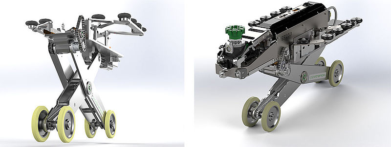 Pipetronics hat das Eiprofilfahrwerk komplett neu konstruiert und als weltweit erstes Unternehmen mit zwei Elektromotoren ausgestattet. Ein Motor sorgt für den Antrieb und die Höhenverstellung, ein zweiter Motor treibt eine Scherenmechanik an, die für die seitliche Stabilisierung des Roboters im Kanal sorgt. Beide Einstellungen liegen im Blickfeld der Kamera und können so genau kontrolliert werden.
