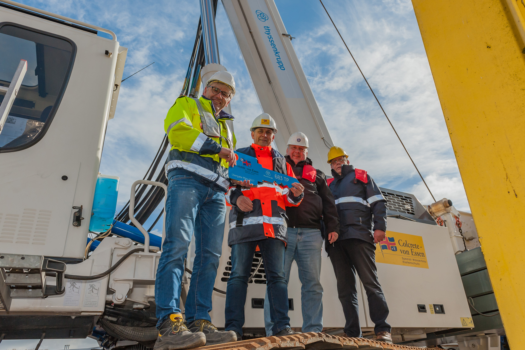 Am 17. März 2017 war es soweit: Die thyssenkrupp Infrastructure konnte einen Teleskopkranmäkler 683 TP offiziell an den Kunden, die Colcrete - von Essen GmbH & Co. KG aus Rastede bei Oldenburg, übergeben. Der Teleskopkranmäkler ist das Ergebnis einer Zusammenarbeit der thyssenkrupp Infrastructure GmbH, der Sennebogen Maschinenfabrik GmbH, der niederländischen Unternehmen Machinefabriek A. van Hattem & Zoon B.V. und Euro-Rigging B.V.