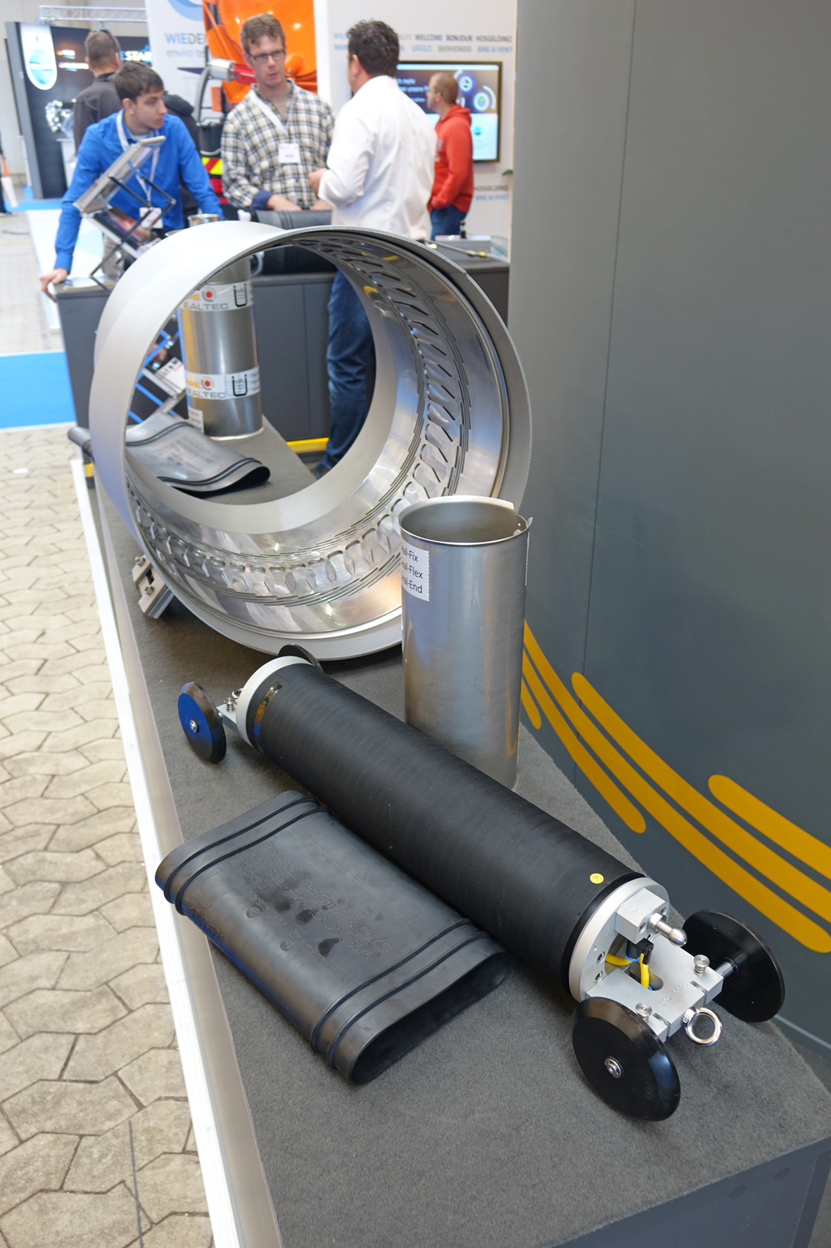 Pünktlich zur Messe konnte Pipe-Seal-Tec die Erweiterung des Nennweitenbereichs der flexiblen Edelstahlhülse Pipe-Seal-Flex bis DN 600 vermelden. Damit kann das Unternehmen mit Pipe-Seal-Flex nun den gesamten Nennweitenbereich DN 200 - 600 am Markt bedienen. Am Stand präsentiert wurde eine Pipe-Seal-Flex Hülse DN 500 mit 9° Achsabweichung und 30 mm Dimensionswechsel inklusive Rohrversatz. Auch die weiter entwickelte und optimierte Oberflächenqualität der Pipe-Seal-Produktserie überzeugte das Fachpublikum, denn sie ermöglicht eine noch sicherere und schnellere Installation und macht den Einsatz von Öl überflüssig.