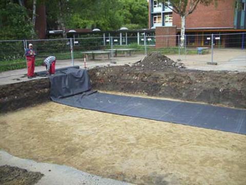 In die Baugruben für die Rückhaltefelder wurde zunächst die EPDM-Folie eingebracht. Dabei wurden die Folien von INTEWA so vorkonfektioniert, dass pro Feld eine Folie aus einem Stück zu einer Wanne ausgelegt werden konnte. Das Schweißen oder Kleben von Folien konnte damit komplett entfallen.