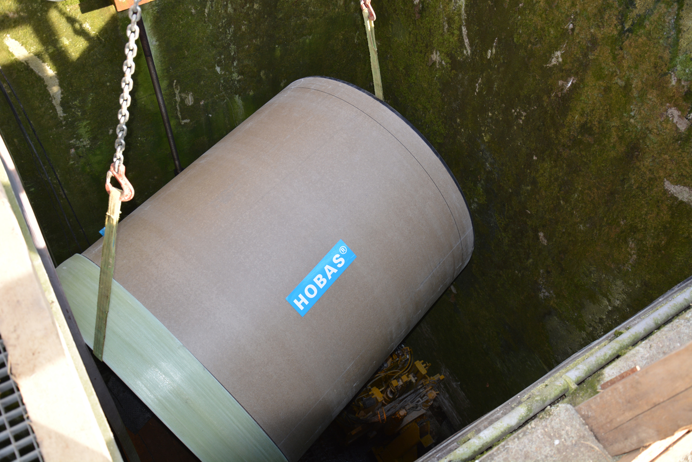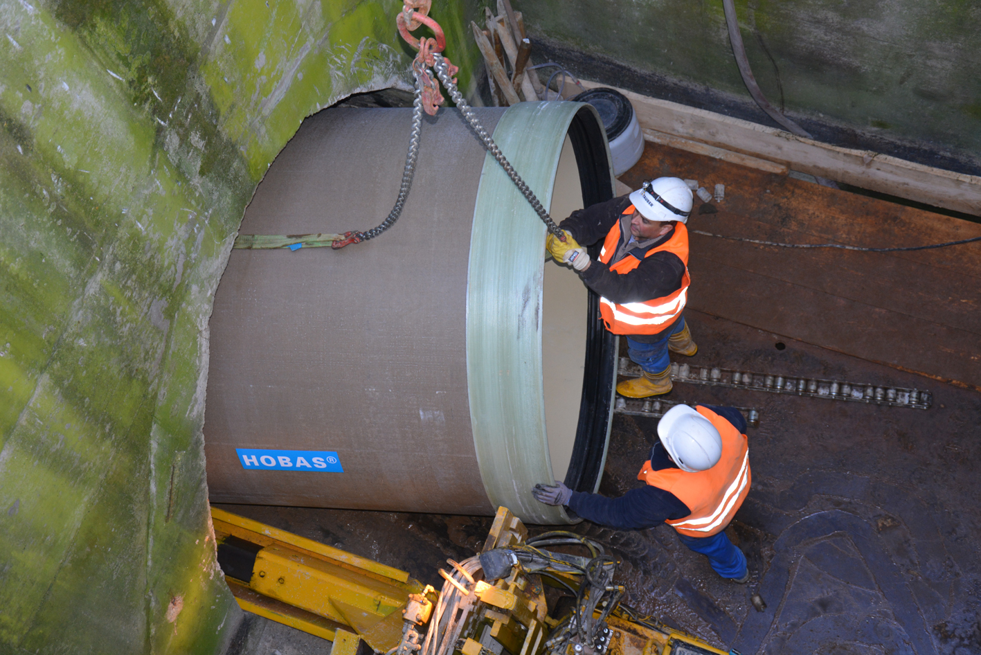 Aufgrund der bebauten Fläche über dem Altprofil war ein Neubau oder die Sanierung im offenen Graben ausgeschlossen. Da nur die grabenlose Sanierung mit statisch tragfähigem Material in Frage kam, fiel die Entscheidung schnell auf eine Sanierung mit GFK Rohren. Mit dem geringen Gewicht, der individuell bemessbaren statischen Tragfähigkeit, Korrosionsbeständigkeit und der einfachen Verlegung im Kurzrohr-Relining stellen HOBAS GFK Rohrsysteme eine ideale Lösung für die grabenlose Sanierung von beschädigten Rohrleitungen dar.