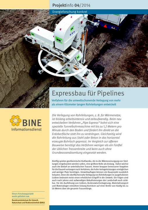 Ein Fahrer im Operatorfahrzeug überwacht und steuert die Anlage entlang der Trasse. Über die so verlegten Pipelines können Fern- und Nahwärme, Kommunikations- und Datenleitungen, Stromkabel, Öl, Gas sowie Wasser übertragen oder transportiert werden. Für die Einbindung von Geothermie-kraftwerken in die Wärmeversorgung von Siedlungen kann das Pipe-Express-Verfahren zukünftig eine größere Rolle spielen. Das Pipe-Express-Verfahren wurde von der Herrenknecht AG entwickelt und aus Mitteln des Bundesumweltministeriums gefördert.