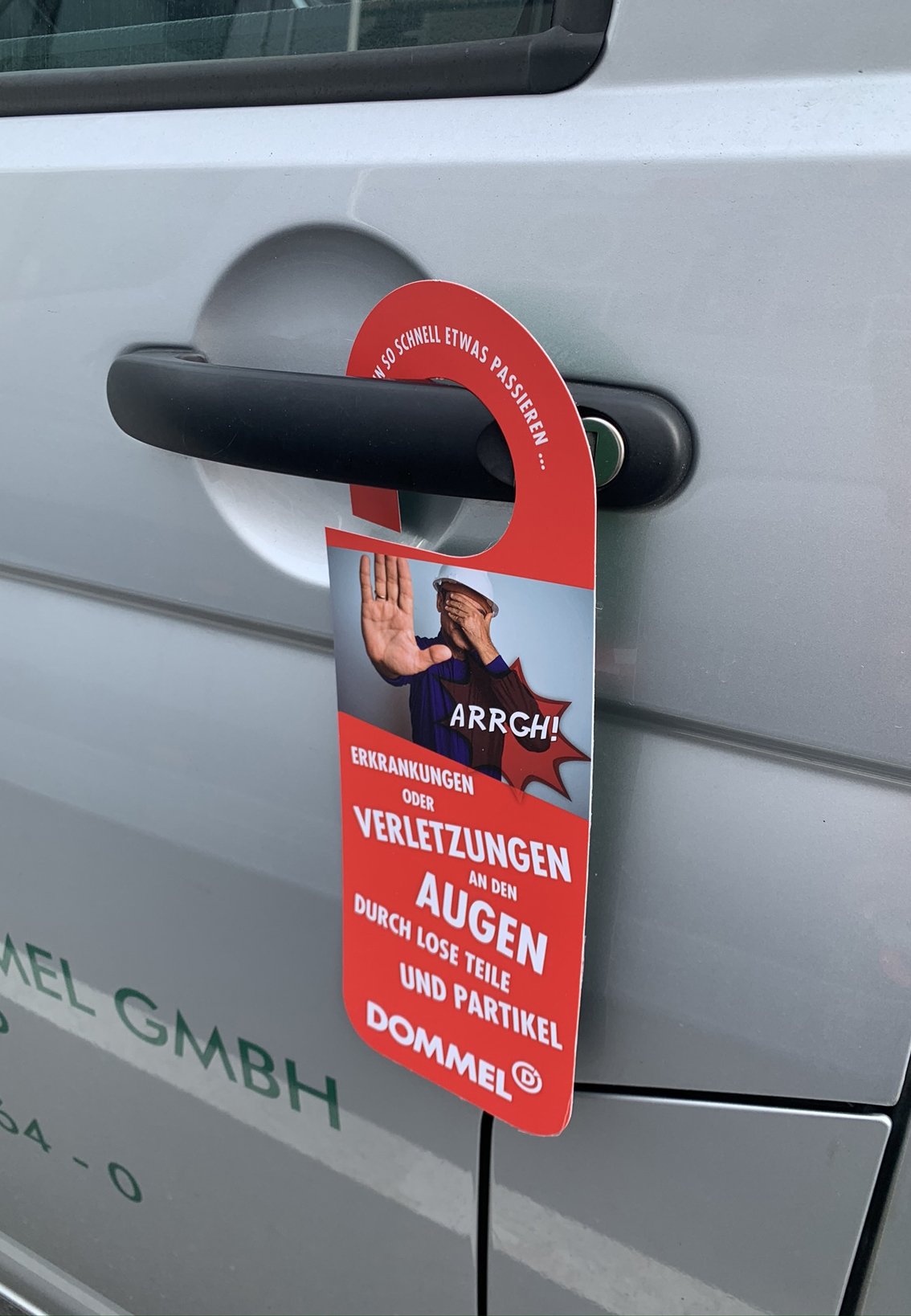 „Um unsere Mitarbeiter regelmäßig auf bestimmte Themen aufmerksam zu machen, haben wir auffällige Türhänger drucken lassen. Diese werden den Kolonnen einmal im Monat – immer mit unterschiedlichen Themenschwerpunkten – an die Fahrzeuge gehängt“, erklärt Benedikt Stentrup, Geschäftsführer der Sanierungstechnik Dommel GmbH.