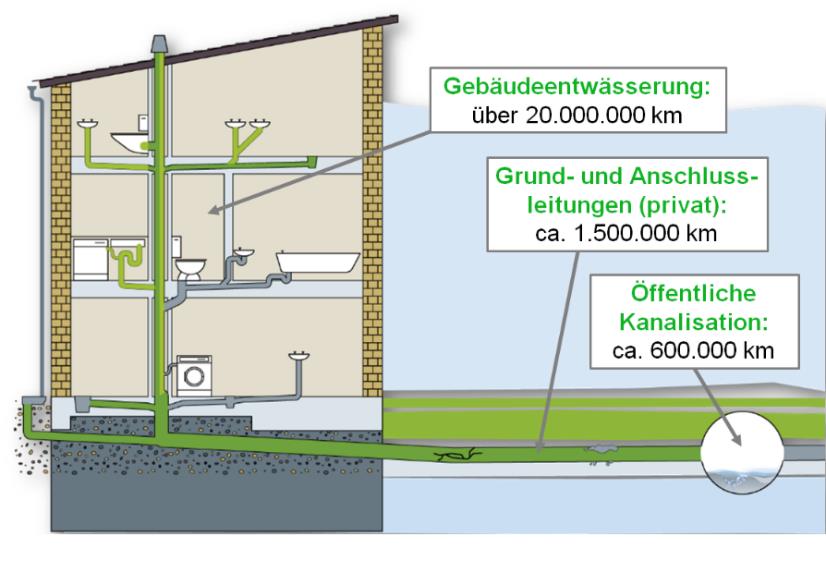 Während sich die Länge der öffentlichen Kanalisation mit ca. 600.000 Kilometern aus statis-tischen Erhebungen gut ableiten lässt, sind valide Zahlen für die private Entwässerung kaum verfügbar. Die Fachwelt geht davon aus, dass die Länge der privaten Grundstücksentwässerung etwa das zwei- bis dreifache der öffentlichen Kanalisation beträgt, so dass von einer Länge von etwa 1.500.000 Kilometern ausgegangen werden kann.