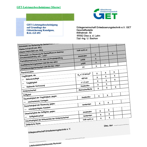 Für Schachtabdeckungen und Aufsätze mit dem Gütezeichen RAL-GZ 692 gibt es Leistungsbescheinigungen. Das Gütezeichen RAL-GZ 692 wird von der RAL Gütegemeinschaft Entwässerungstechnik (GET) verliehen. In der GET-Leistungsbescheinigung sind die Leistungen des jeweiligen Produktes dokumentiert und öffentlich einsehbar. Dies ermöglicht der ausschreibenden Stelle Leistungsdaten von Produkten verschiedener Hersteller zu vergleichen und das für den aktuellen Bedarf optimale Produkt zu wählen.