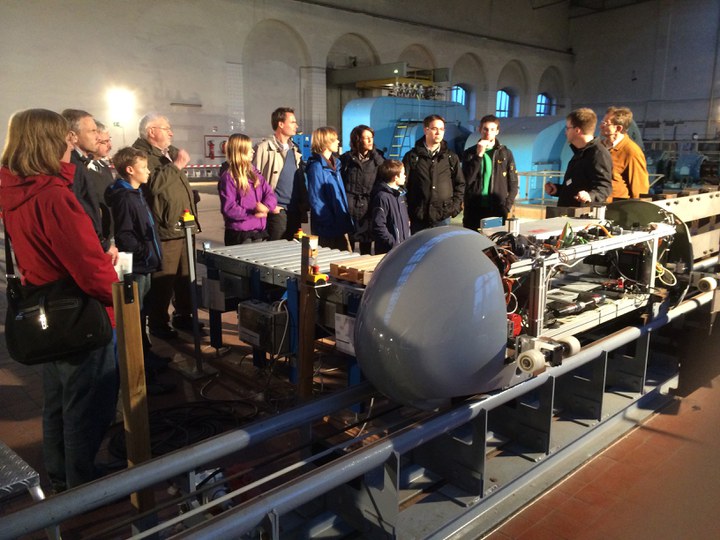Infolge dessen waren die auf rund 45 Minuten angesetzten Vorführungen quasi im Handumdrehen schon wieder vorbei. Entsprechend zufrieden äußerten sich auch die verantwortlichen Projektpartner: Während sich Dipl.-Inf. Sebastian Iffländer (Mediaagentur visaplan GmbH) hocherfreut über den Wissensdurst der Besucher zeigte ("Wahnsinn – die Leute haben jedes Detail unseres Animationsfilms förmlich aufgesogen, nur um uns am Modell mit weiterführenden Fragen zu überschütten."), war Dr.-Ing. Robert Stein (Planungsbüro S & P Consult GmbH) verblüfft vom Hintergrundwissen des Publikums: "Wenn quasi die erste Frage direkt schon darauf abzielt, mit welcher Frequenz denn der benötigte Strom kontaktlos an die Motoren übertragen wird… da kann man wirklich nur staunen, mit welcher Hingabe sich die Gäste dieser zukunftsträchtigen Thematik widmen. Aber dank Herrn Glavac von SEW Eurodrive konnten ja sogar die kniffligsten Fragen zur Antriebstechnik sofort beantwortet werden."