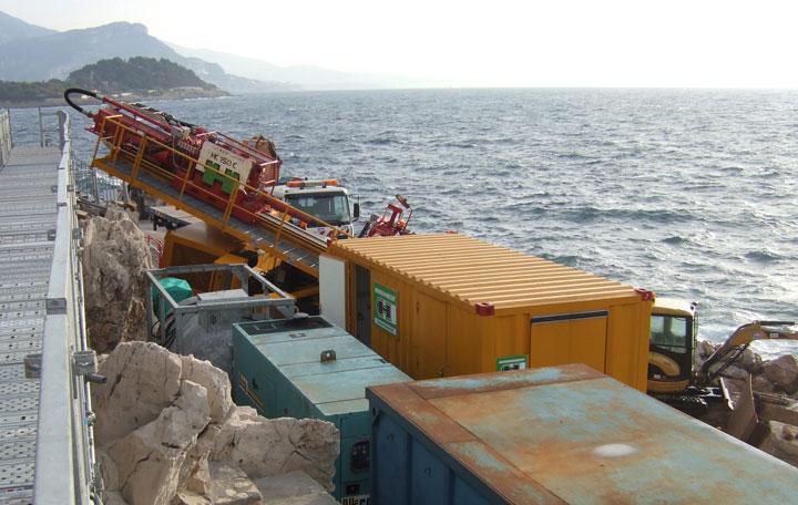 Der Meeresboden ist am „Pointe de la Causinière" mit Korallen bewachsen. Zum Schutz der Umwelt kann der Abraum nicht wie sonst üblich mit Bentonit abgefördert werden. Stattdessen wird mit Kompressoren Druckluft erzeugt und das abgebaute Material herausgeblasen. Die Geologie – zu Beginn brüchiges und poröses Faltgebirge aus Ton und Kalkstein, dann verwitterte Gesteinsschichten und Sandformationen – fordert die bauausführende Firma RPS sowie die Vortriebstechnik heraus. Die ersten 10 Meter des Tunnels werden mit Beton ausgekleidet. Dies verhindert Einbrüche und gleichzeitig wird die Abraumförderung per Druckluft effektiver.
