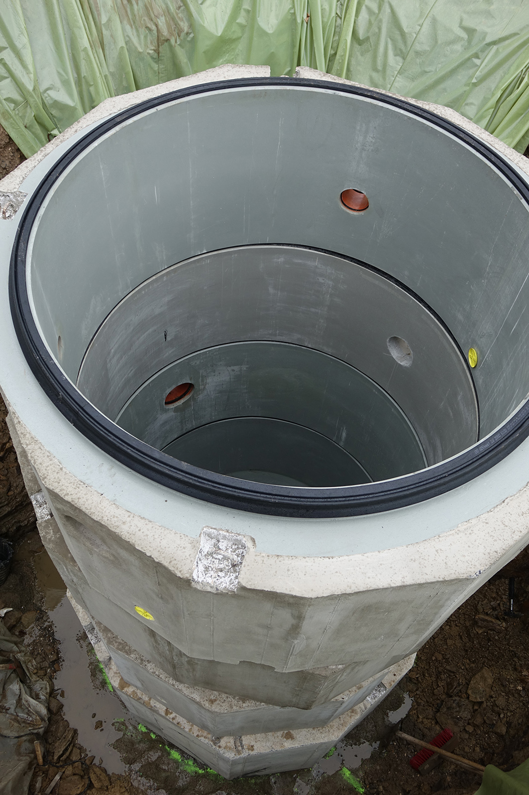 Der kreisrunde FABEKUN-Schacht sollte komplett vorgefertigt werden und über sämtliche Öffnungen für die Einbindung der PP-Abwasserleitung DN 250, Belüftungs- und Entlüftungsleitungen - ebenfalls aus PP - jeweils mit DN 150 sowie der Druckleitung DN 100 und der drei Kabelleerrohre mit jeweils einem Außendurchmesser DA 110 verfügen.