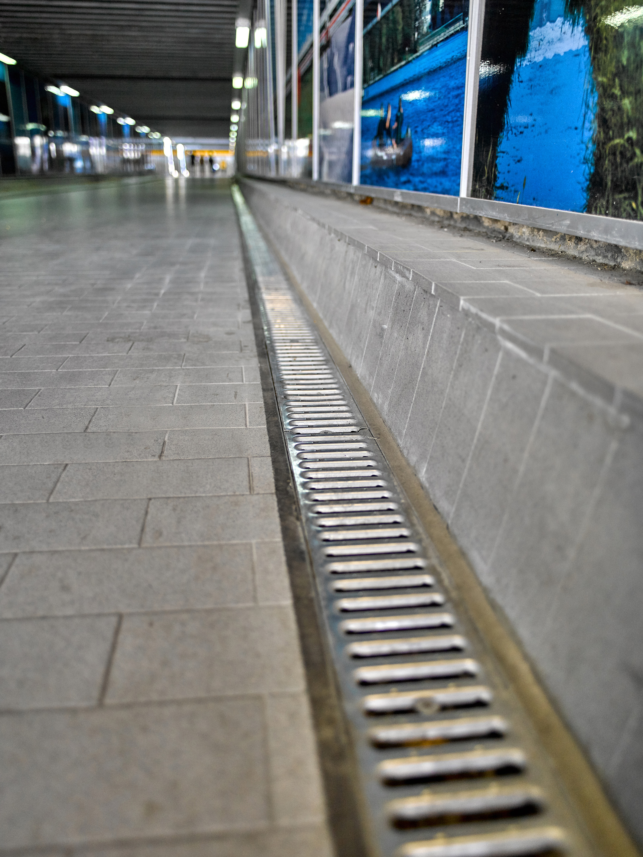 Wie könnten Breite und Tiefe für eine bestmögliche Hydraulik maximal ausgereizt werden? Und welche Rinne gewährt optimale Standfestigkeit? Eine flache Standardrinne hätte einen Umbau des Bahnsteigs notwendig gemacht; eine komplette Sonderanfertigung wäre zu teuer gewesen. So entpuppte sich ein Hybridmodell aus einer Sonderanfertigung für die Ablaufverbindungen und einer Edelstahlrinne von 45 mm Bauhöhe – der Dachfix Steel mit geschlossenem Rinnenkörper und Stegrostabdeckung – als optimale Lösung.