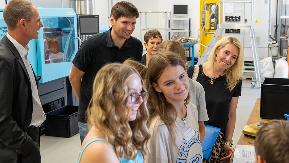 Bei ihrem Besuch in der vergangenen Woche konnte Staatssekretärin Stolz einen umfassenden Eindruck gewinnen, wie sich die teilnehmenden Jugendlichen im SKZ-Lab einen ganzen Tag praktisch und in lebendiger Teamarbeit mit wichtigen Fragen der Kunststoffproduktion beschäftigen. Staatssekretärin Stolz erlebte bei ihrem Rundgang zusammen mit SKZ-Institutsleiter Prof. Dr. Martin Bastian engagierte Jugendliche voll bei der Sache, die ihre Aufgaben in kleinen Teams angehen. Und sogar die Herstellung von Produkten live an Maschinen unter Anleitung der SKZ-Betreuer/-innen durchführen dürfen. Auch der umweltfreundliche Umgang mit Kunststoffen und die Chancen und Herausforderungen der Kreislaufwirtschaft von Kunststoffen wird aktiv diskutiert und so das eigene Verhalten im Umgang mit Kunststoffen hinterfragt.