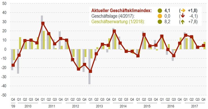 Nachdem der Geschäftsklimaindex – eine Aggregation der Geschäftslage und Geschäftserwartung – im 3. Quartal 2017 im Vergleich zum Vorquartal mit einem Wert von 2,3 Punkten deutlich sank, stabilisierte sich das Absatzniveau zum Ende des vergangenen Jahres. Im 4. Quartal stieg der Geschäftsklimaindex im Vergleich zum Vorquartal leicht an und erreichte einen Wert von 4,1 Punkten.