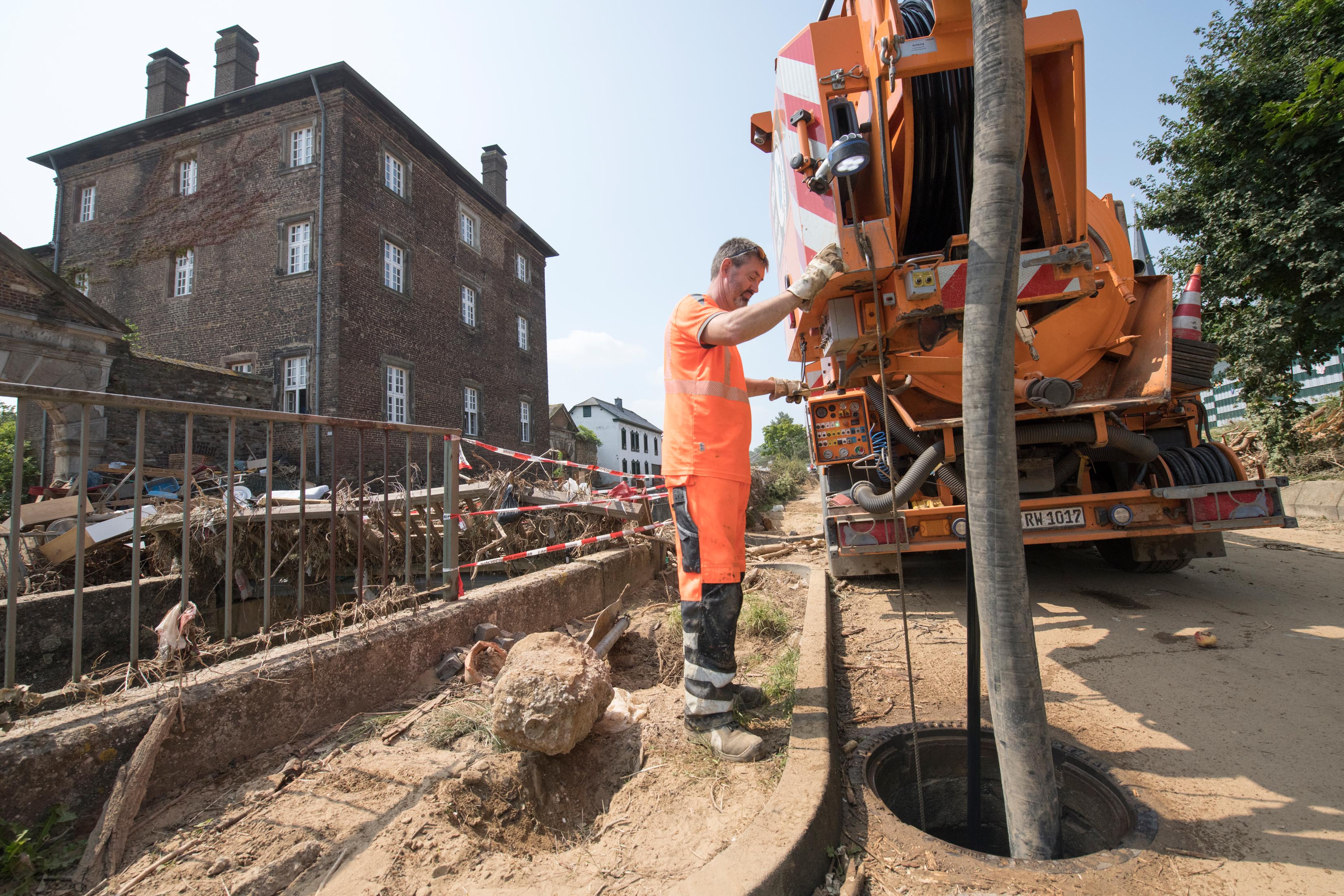 Nach der Starkregen-Katastrophe in Nordrhein-Westfalen und Rheinland-Pfalz muss die Kanalisation umgehend wieder in Funktion gesetzt werden. Sonst können nachfolgende Regen nicht abfließen und es drohen erneute Überflutungen. Das IKT - Institut für Unterirdische Infrastruktur bringt Kommunen, die Hilfe brauchen, und solche, die helfen wollen, zusammen. In dreizehn Städten und Gemeinden waren und sind Kanalreinigungsfahrzeuge von außerhalb im Einsatz.
