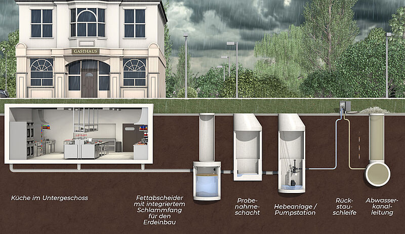 Fettabscheider sind wichtige Bausteine, um die Kanalisation und damit das Gemeingut zu schützen und zu erhalten. Da Starkregenereignisse zunehmen, müssen Fettabscheider vor überlasteten Kanalisationen und Rückstau durch den Einsatz einer Doppelpumpstation mit Rückstauschleife geschützt werden.