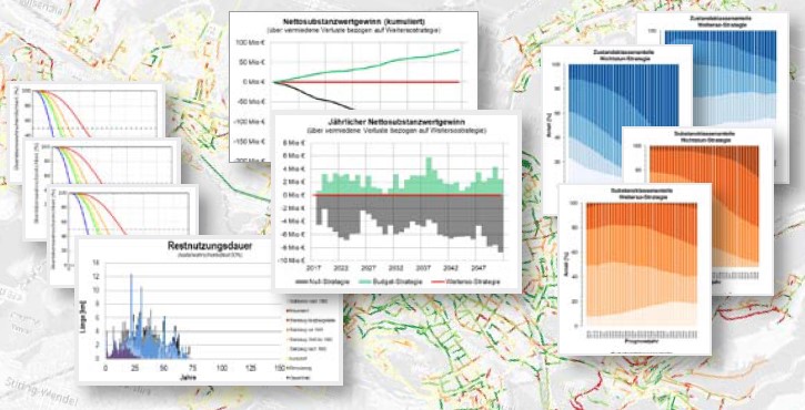In weiteren Analysen wurde die IST-Situation per Gegenwartsprognose fortgeschrieben und damit die Erkenntnislücken bei Inspektionsdaten geschlossen. Eine „Weiterso-Strategie“ als Referenzprognose bildete die zukünftige Netzentwicklung bei Beibehaltung des gegenwärtigen Vorgehens belastbar ab.