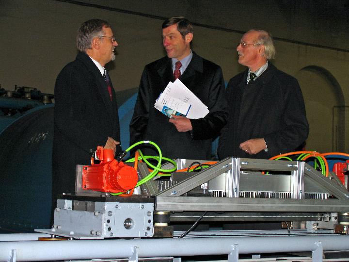 Staatssekretär Günter Kozlowski, Ministerium für Bauen und Verkehr NRW, erlebte am Montag, den 19.12.2005 im Beisein von Prof. Dr.- Ing. Dietrich Stein, dem Rektor der Ruhr-Universität Bochum, Prof. Dr.-Ing. Gerhard Wagner sowie den Industriepartnern RWE Power AG und SEW Eurodrive, die Premierefahrt des ersten CargoCap Prototyps auf dem vom Forschungsteam um Juniorprofessor Dr.-Ing. Jan Scholten errichteten ersten Teilstück der Modellstrecke. Im stillgelegten Maschinenhaus des Heizkraftwerkes Bochum (RWE Power AG) beteiligte er sich am symbolischen Spatenstich für den Aufbau und den wissenschaftlichen Betrieb der CargoCap Modellstrecke.