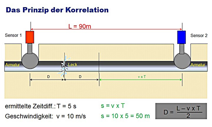 Im zweiten Schritt wird das Leckgeräusch an mehreren Punkten des Leitungssystems aufgenommen. Indem die Zeitunterschiede, mit denen der Schall die jeweiligen Kontaktstellen erreicht, miteinander korreliert werden, lässt sich die Leckposition punktgenau errechnen. Mit dem Korrelations-Loggersystem Enigma bietet Esders eine Lösung an, die nachts vollautomatisch korrelierbare Geräuschdaten über mehrere Messpunkte sammelt.