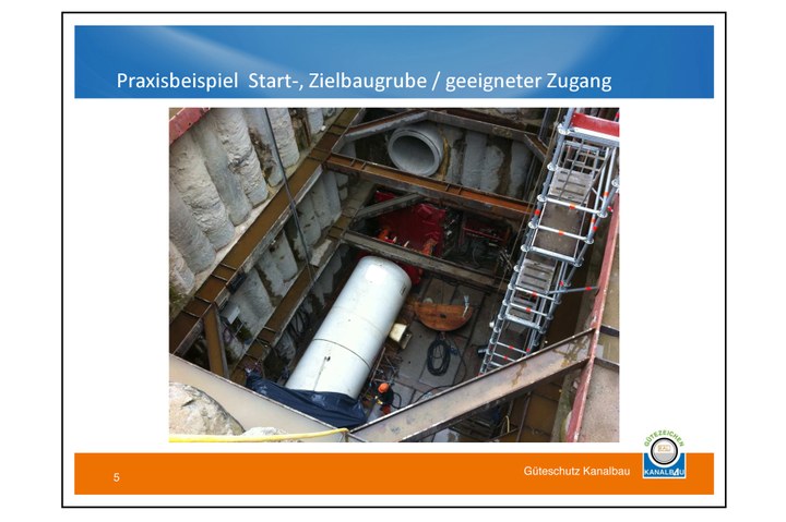 Natürlich finden sich detaillierte Vorgaben in den einschlägigen Regelwerken, auf die Prüfingenieur Tolkmitt in seinem Vortrag exemplarisch einging. So zum Beispiel im Arbeitsblatt DWA-A 125 "Rohrvortrieb und verwandte Verfahren". Das Arbeitsblatt weist explizit darauf hin, dass Rohrvortriebe zu den schwierigen Bauverfahren zählen, für deren Planung, Ausschreibung und Vergabe besondere technische und vertragliche Kenntnisse sowie umfangreiche Erfahrung vorausgesetzt werden müssen. Mit der Durchführung dieser Aufgaben sollten entsprechend qualifizierte Ingenieure betraut werden. Es wird empfohlen, einen fachkundigen Gutachter für die Auswahl des Vortriebsverfahrens hinzuzuziehen [DWA-A 125:2008-12, Kapitel 7.1, Grundlagenermittlung, Entwurfs- und Ausführungs¬planung, Ausschreibung und Vergabe]. Kapitel 7.2.2 geht speziell auf die Start-, Zwischen- und Zielgruben ein. So müssen Baugruben unter Beachtung der DIN 4124 errichtet und ausgerüstet werden und bei der Konstruktion und Ausführung der Start-, Zwischen- und Zielgruben muss die spätere Nutzung berücksichtigt werden. Insbesondere müssen Baugruben in allen Bauphasen mit geeigneten Zugängen sowie Absturzsicherungen versehen werden.