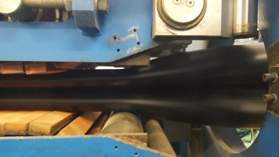 Aufgrund der außergewöhnlichen Einzugslängen muss der Liner in diesem Fall direkt auf der Baustelle im Querschnitt U-förmig verformt werden. AGRU stellte der Baustellenmannschaft daher eine werkseigene Verformeinheit inklusive zweier Raupenabzüge zur Verfügung.