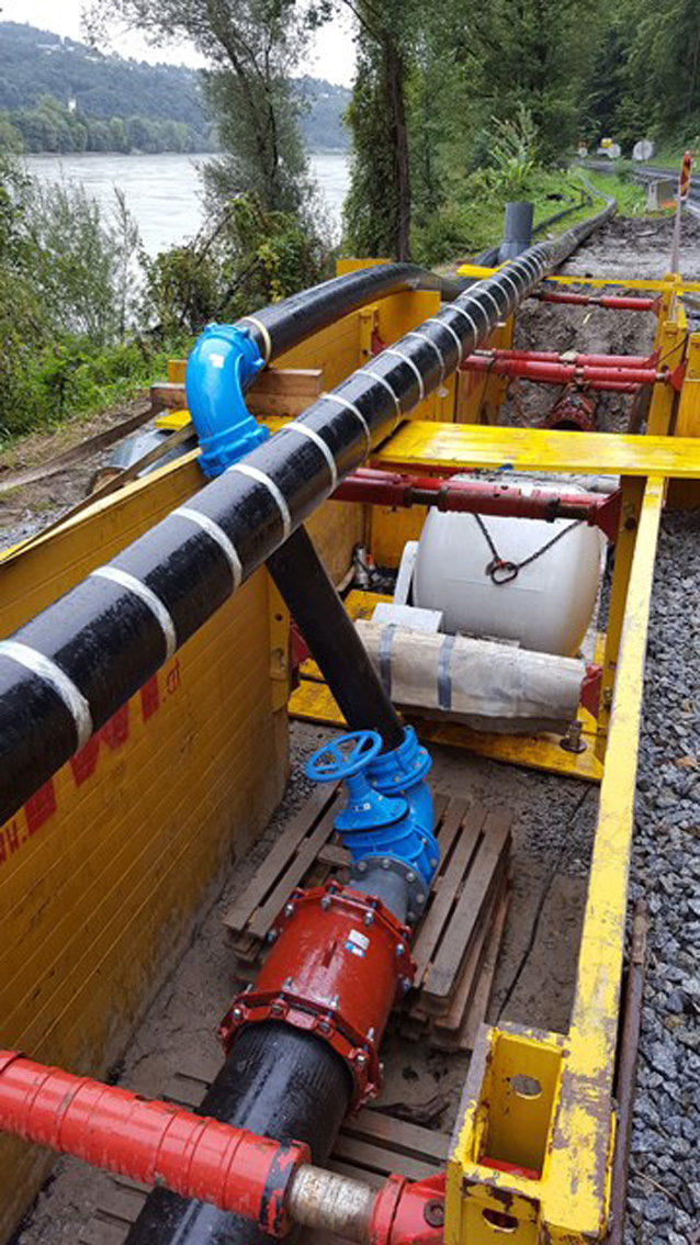 Eine weitere Herausforderung auf dieser Baustelle ist die Aufrechterhaltung des Kanalbetriebs. Zu diesem Zweck wird eine provisorische Druckrohrleitung installiert. Dafür verschweißt das Baustellenteam von AGRU gelieferte PE-Rohre (da 225 mm, SDR 26) zu einer 1800 m langen, oberirdischen PE-Rohrleitung. Sie leitet das Abwasser von jeweils drei Einzugslängen während der Arbeiten ab und wird nach der Sanierung dieser Abschnitte umgesetzt.