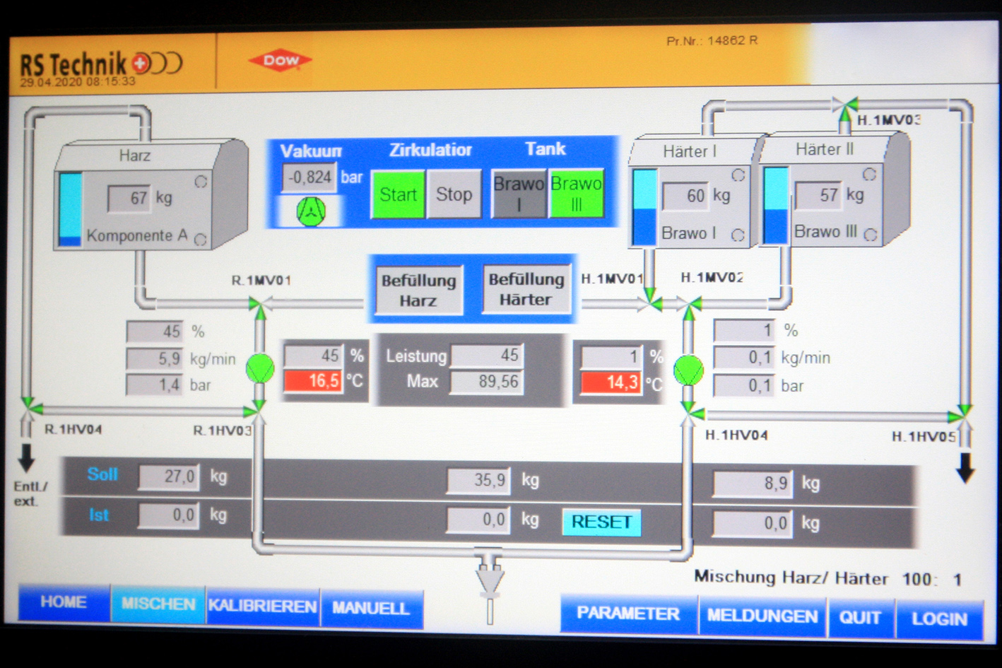 „Auf diese Weise kann die gleichbleibende Harztemperatur unabhängig von äußeren Einflüssen gehalten werden.“ Definierte Harz- und Härtermengen werden über eine regelbare Förderpumpe zum Zwangsmischer transportiert, unter Luftausschluss zusammengeführt und anschließend in den vakuumierten Filzschlauch eingebracht und auskalibriert. Alle systemrelevanten Daten werden durch integrierte elektronische Messgeräte permanent dokumentiert und überwacht.